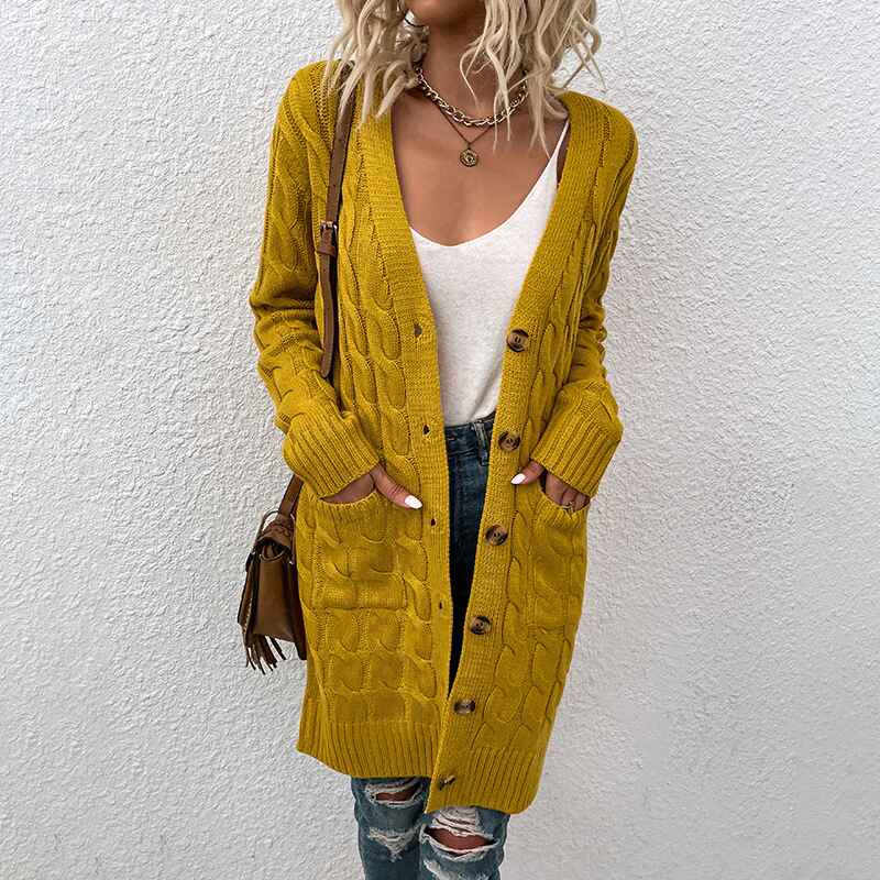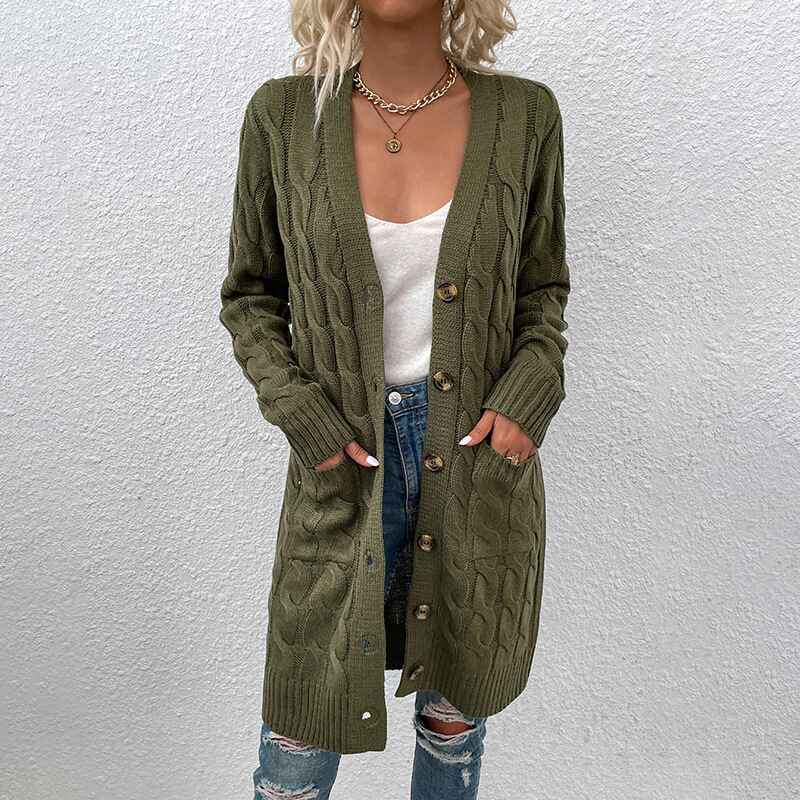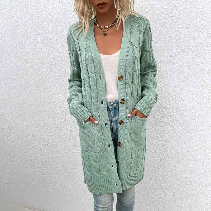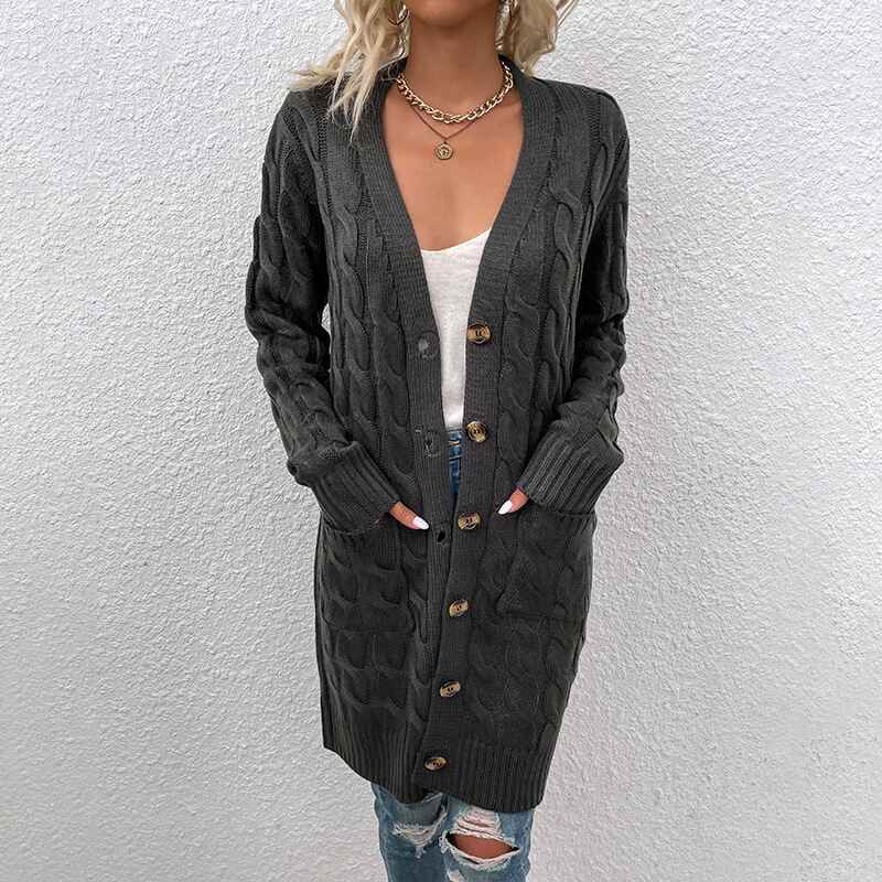 Women Long Sleeve Cable Knit Button Down Midi Long Cardigan Sweater Open Front Chunky Knitwear Coat with Pockets K075