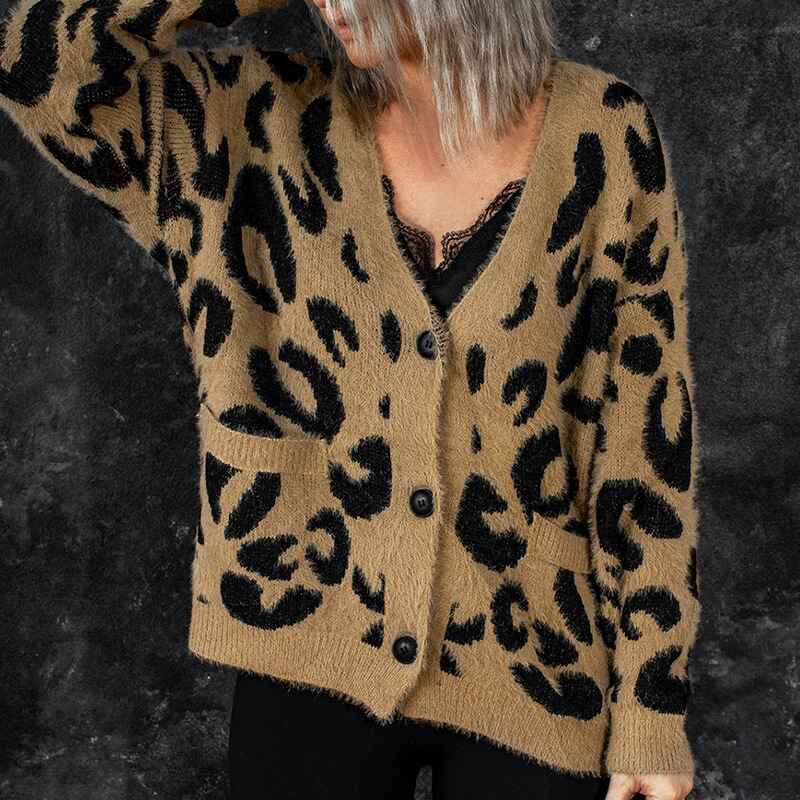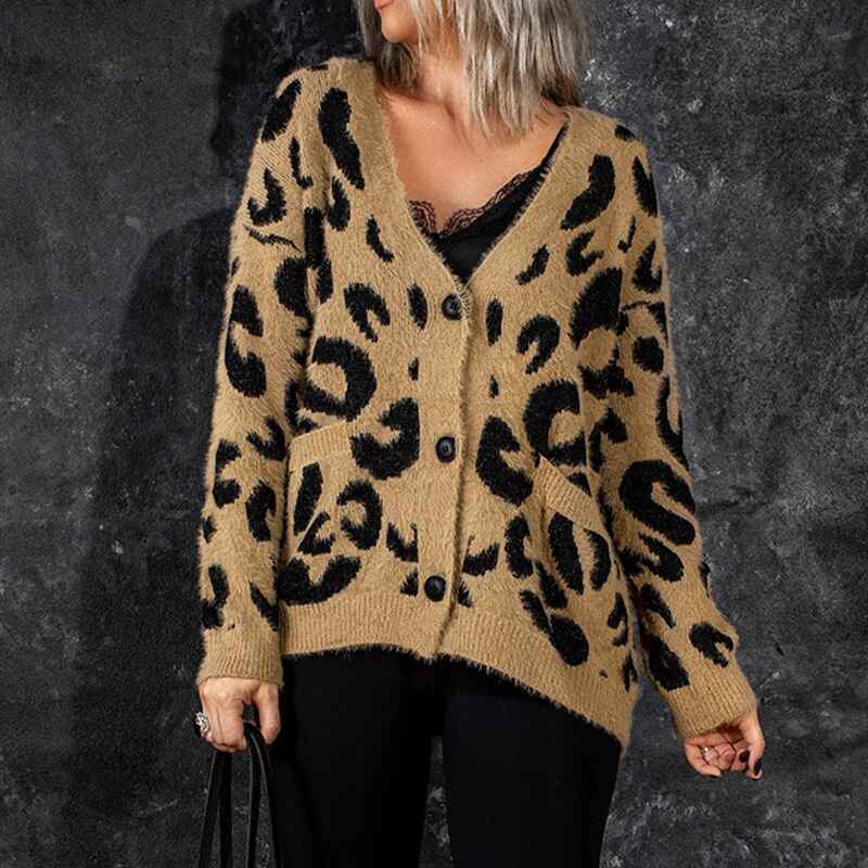 Women's Leopard Print Knitted Sweater Cardigan Open Front Coat Outwear with Pockets K111