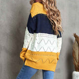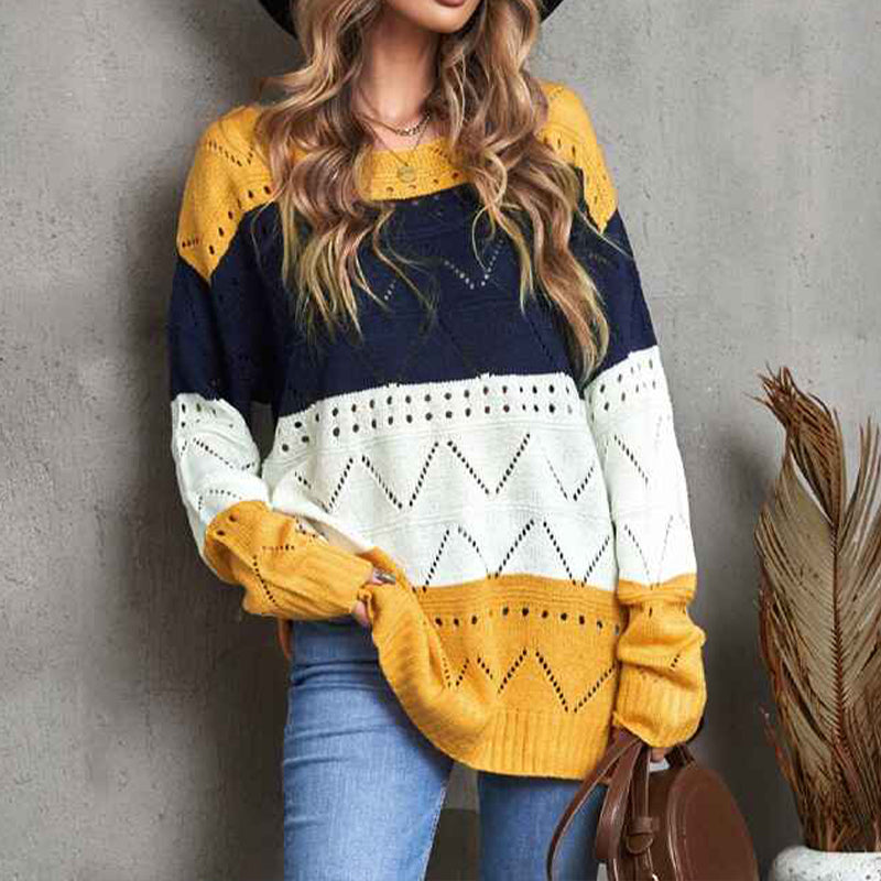 Women's Casual Loose Long Sleeve Fall Sweaters Crew Neck Color Block Knit Pullover Sweater Jumper Tops K142