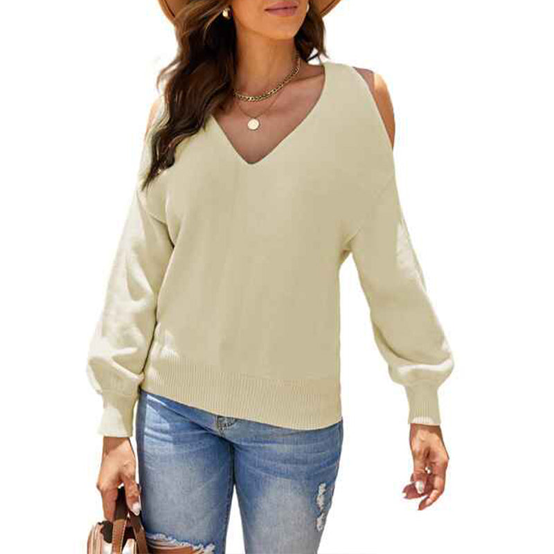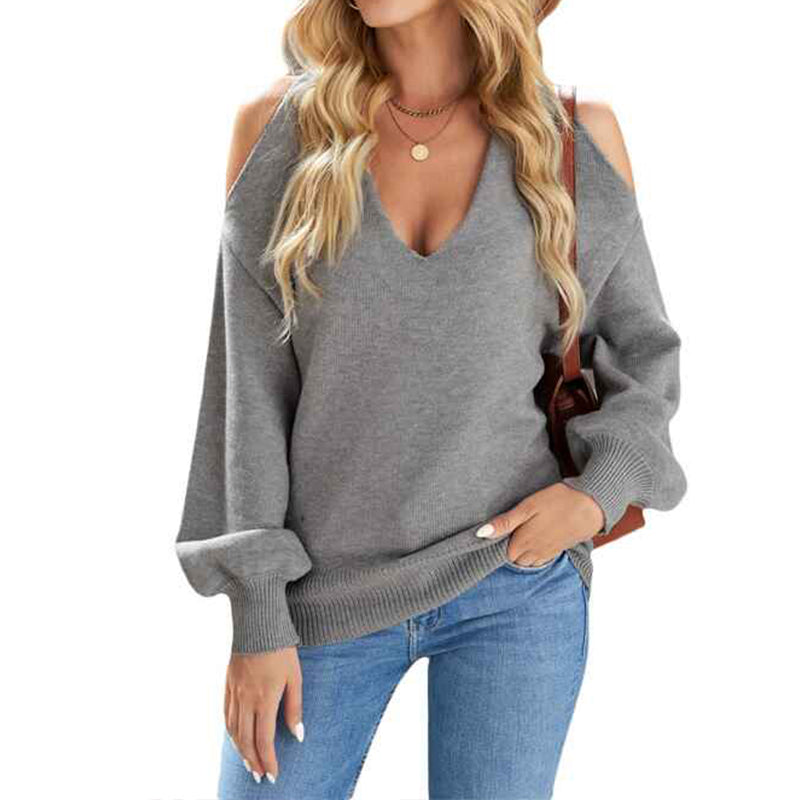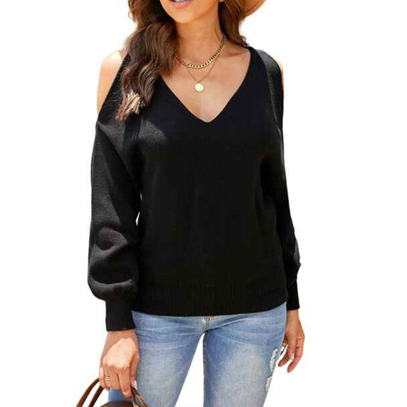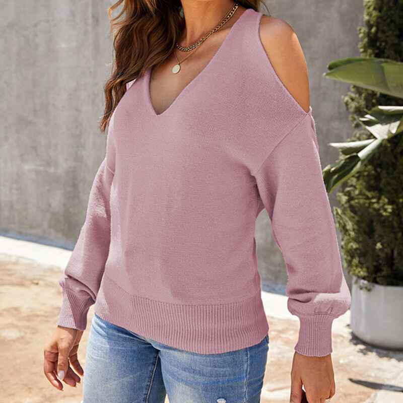 Women's Cold Shoulder V Neck Sweater Slim Cutout Long Sleeve Pullover Ribbed Knit Tops K161