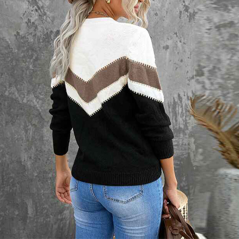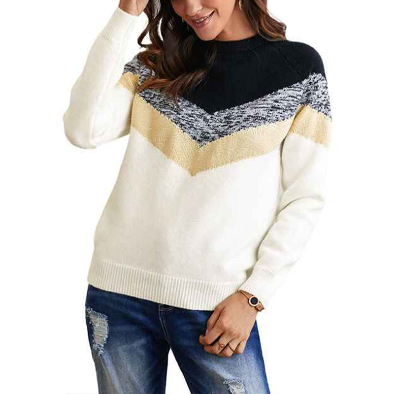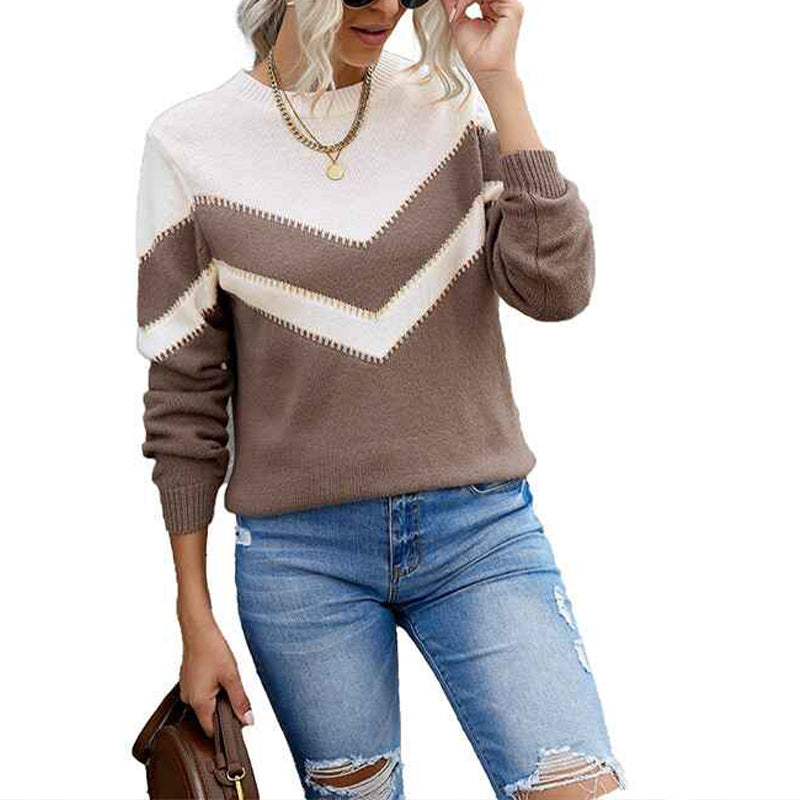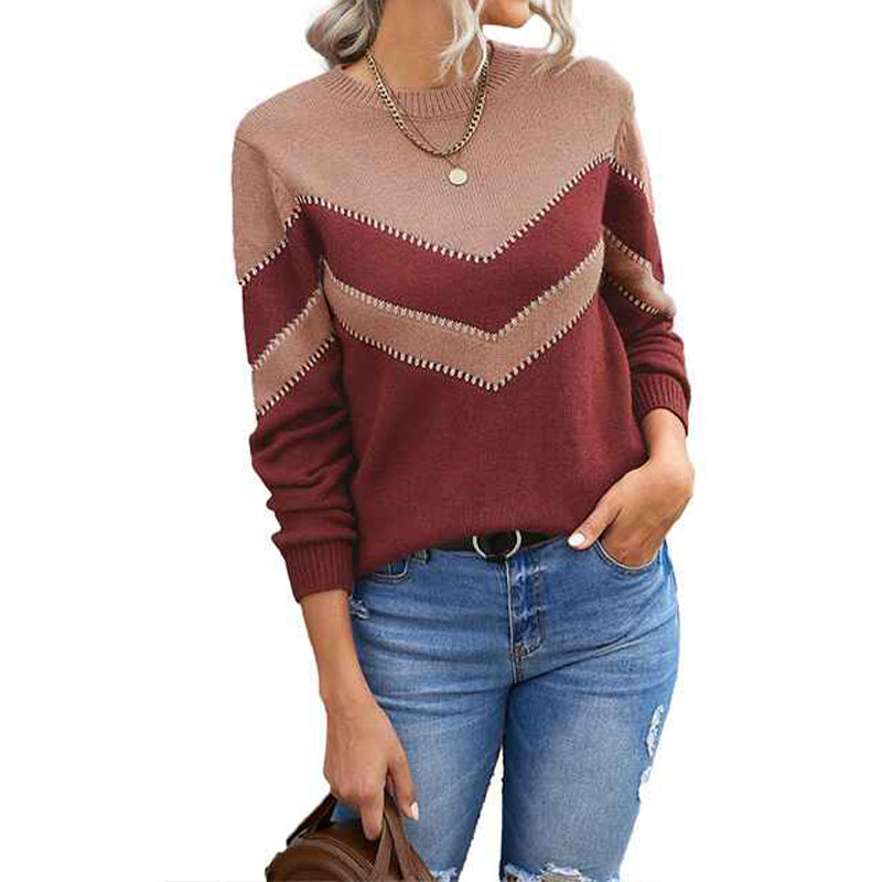 Women Long Sleeve Crew Neck Pullovers Stitching Color Loose Knitted Sweaters K173