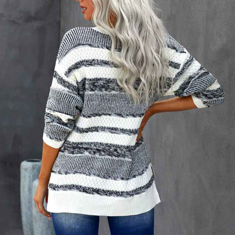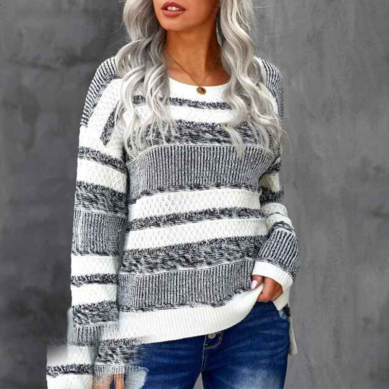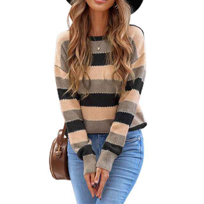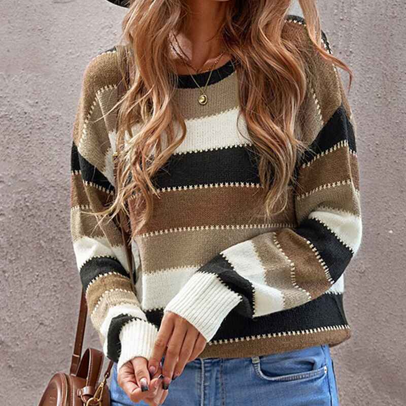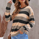 Color Block Sweater for Women Long Sleeve Round Neck Striped Stitching Casual Loose Knitted Pullover Tops K176