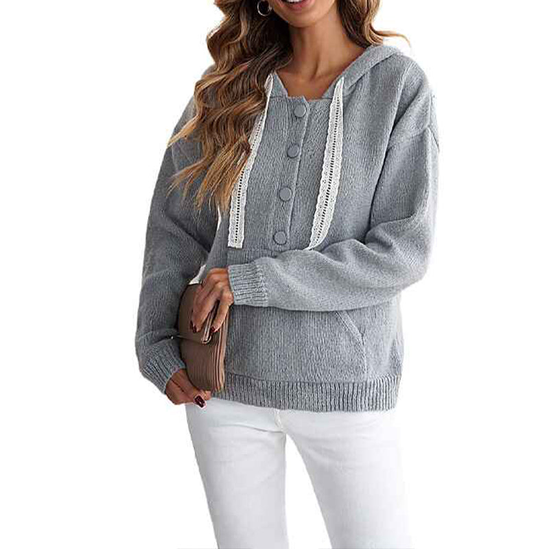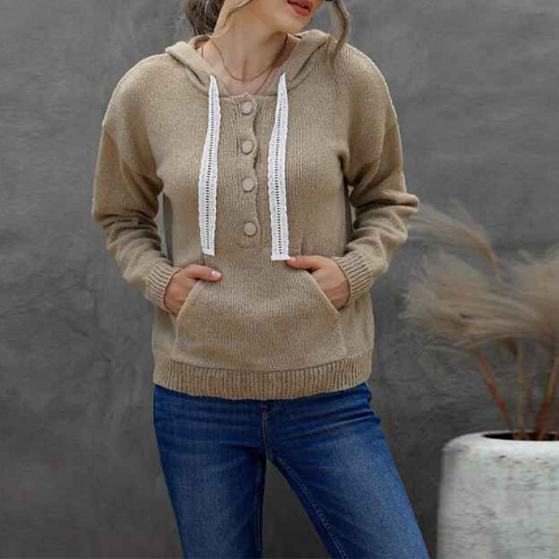 Women's Pullover Hoodie Button Collar Drawstring Long Sleeve Sweatshirt with Pockets K188