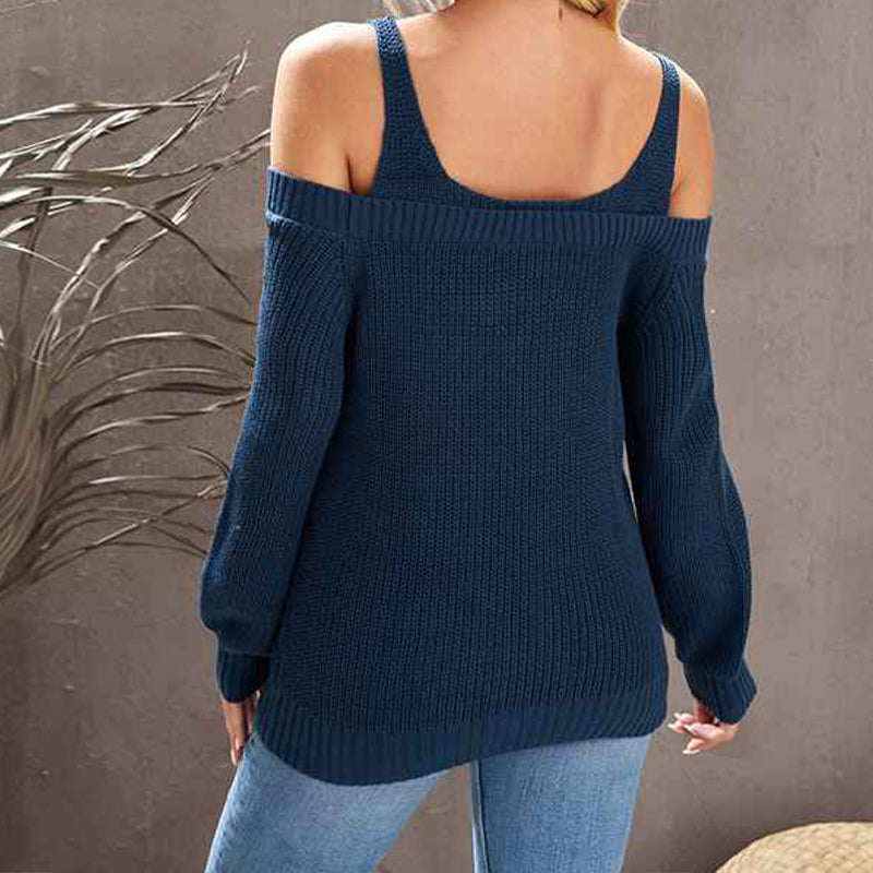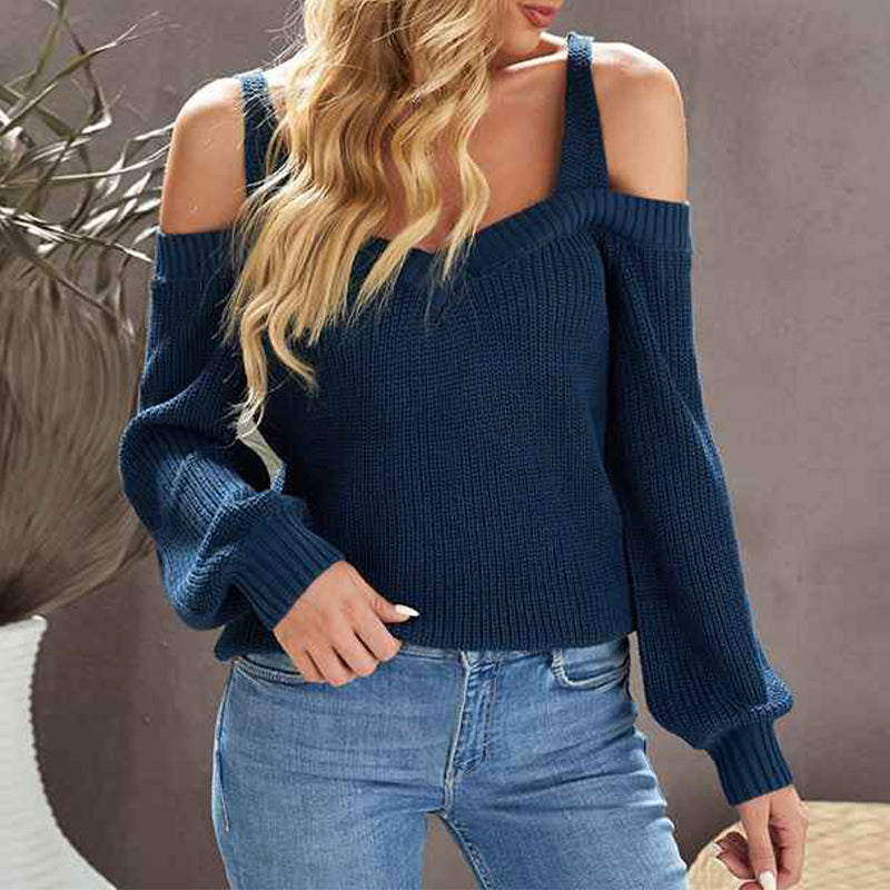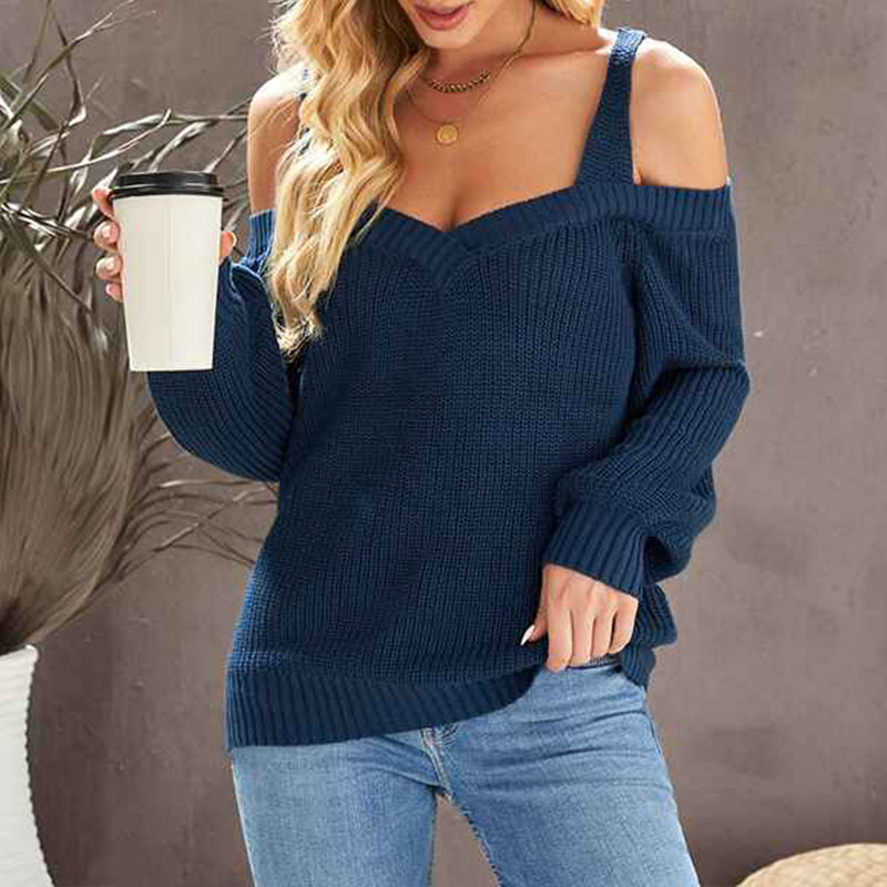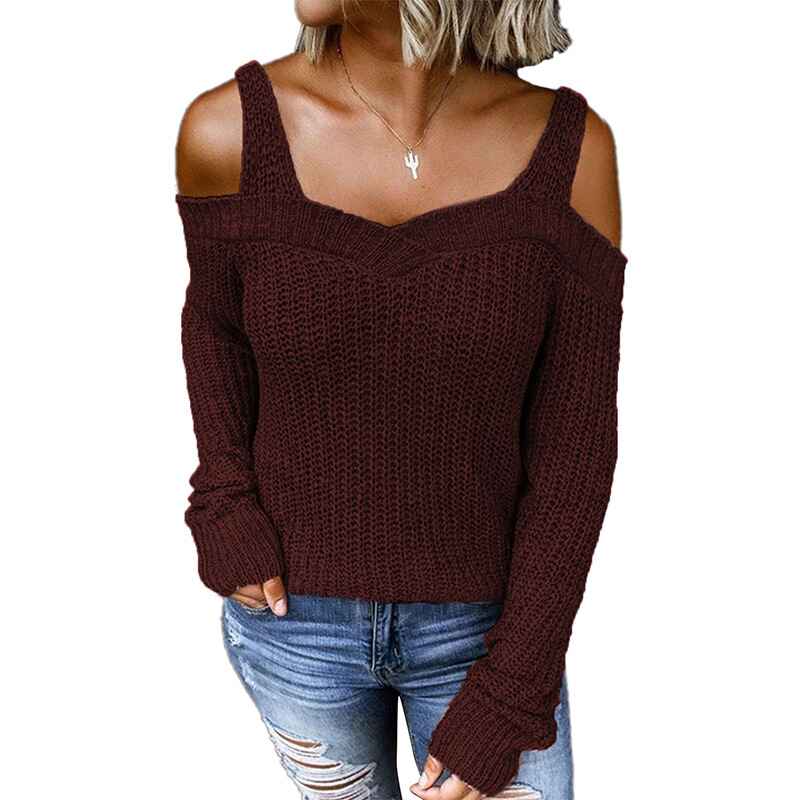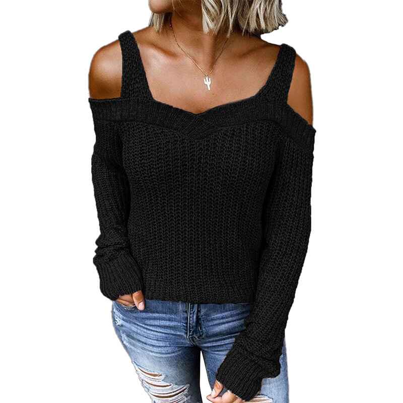 Women's Casual Long Sleeve V Neck Cold Shoulder Knitted Pullover Sweater Top K197