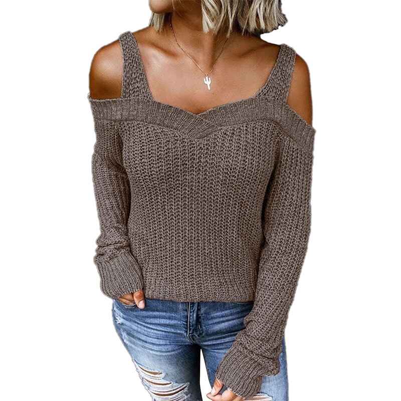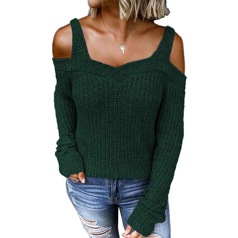 Women's Casual Long Sleeve V Neck Cold Shoulder Knitted Pullover Sweater Top k197
