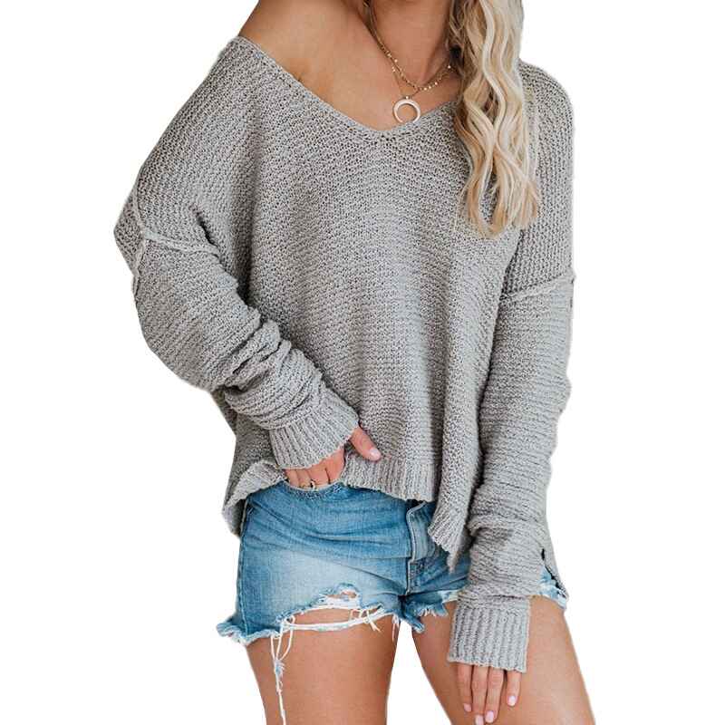 Women’s Casual Long Sleeve V Neck Off Shoulder Loose Baggy Comfy Knit Pullover Sweaters Tunic k092