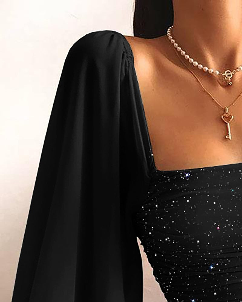 Glitter Lantern Sleeve Ruched Bodycon Dress