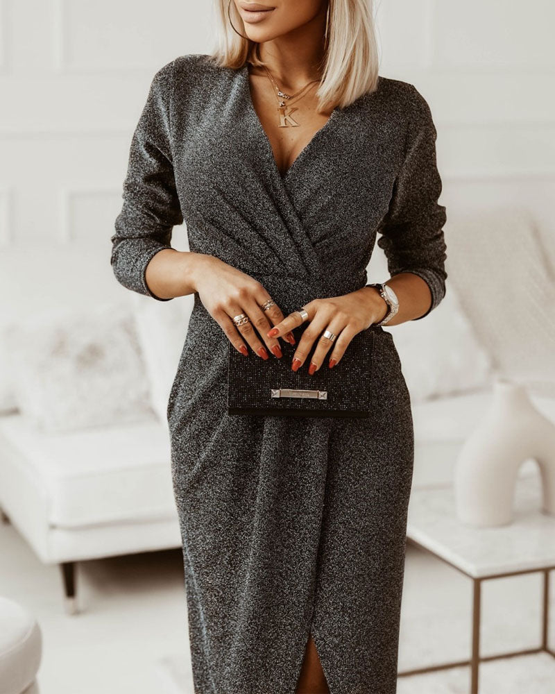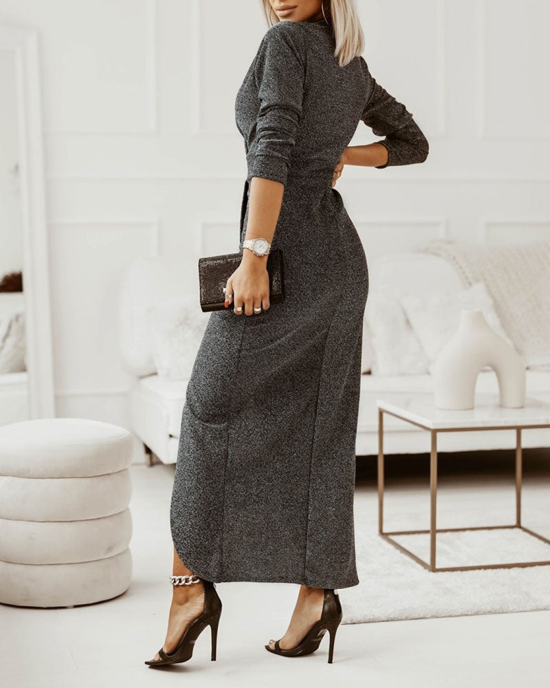 Glitter Long Sleeve Ruched Split Thigh Maxi Dress