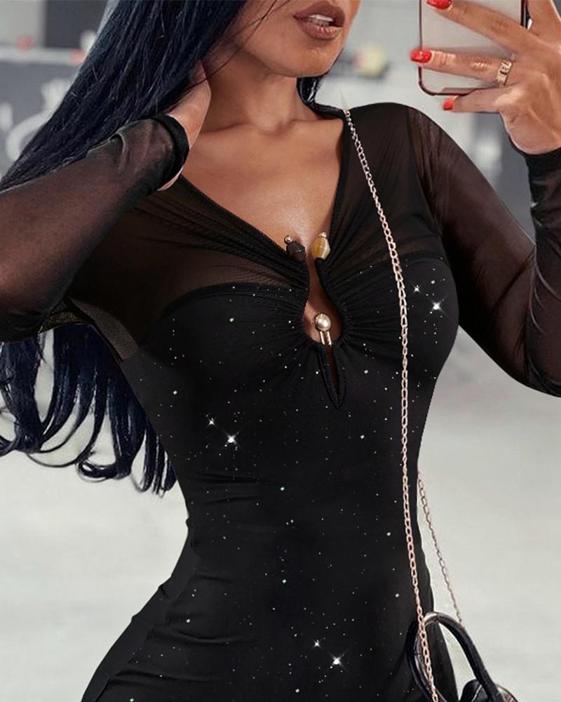 Glitter Lurex Sheer Mesh V Neck Slim Fit Bodycon Long Sleeeve Cutout Mini Party Dress