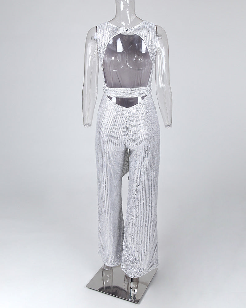 Glitter Round Neck Sleeveless Backless Sequins Jumpsuit