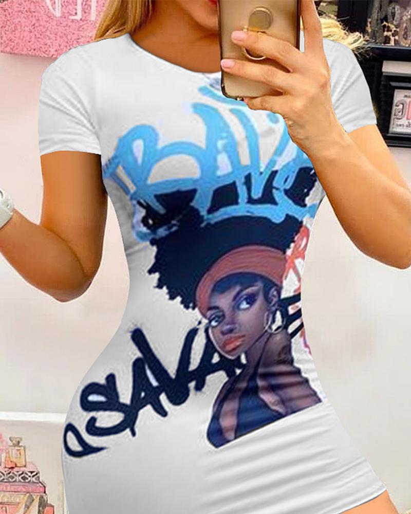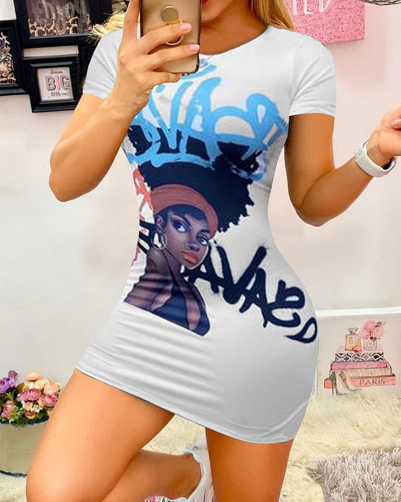 Graffiti Figure & Letter Print Short Sleeve Mini Dress
