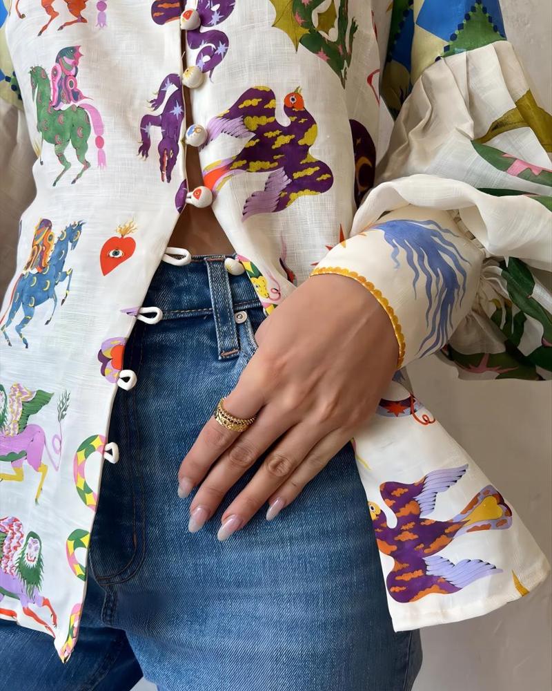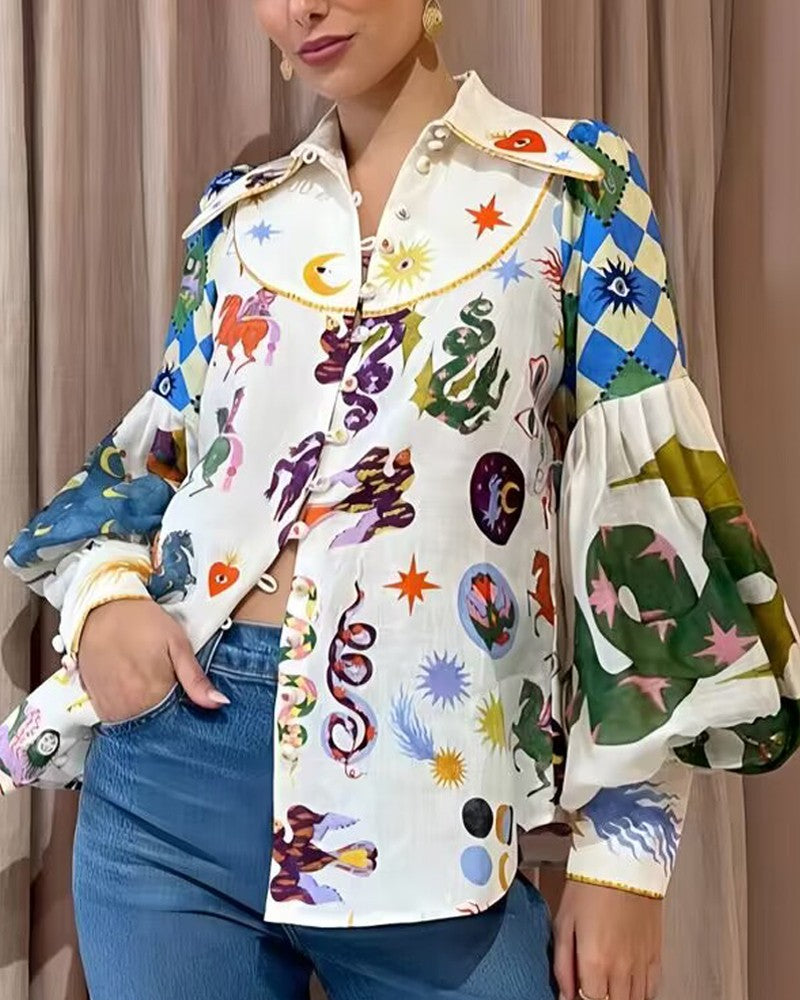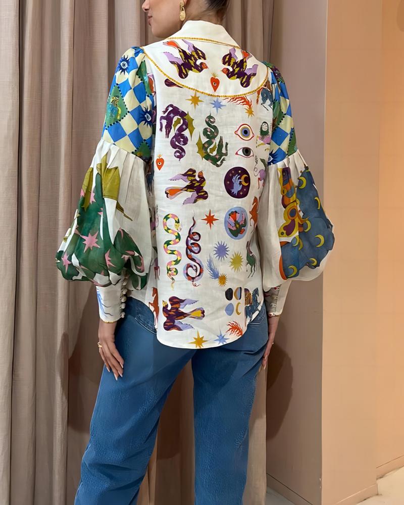 Graphic Cartoon Print Lantern Sleeve Buttoned Top