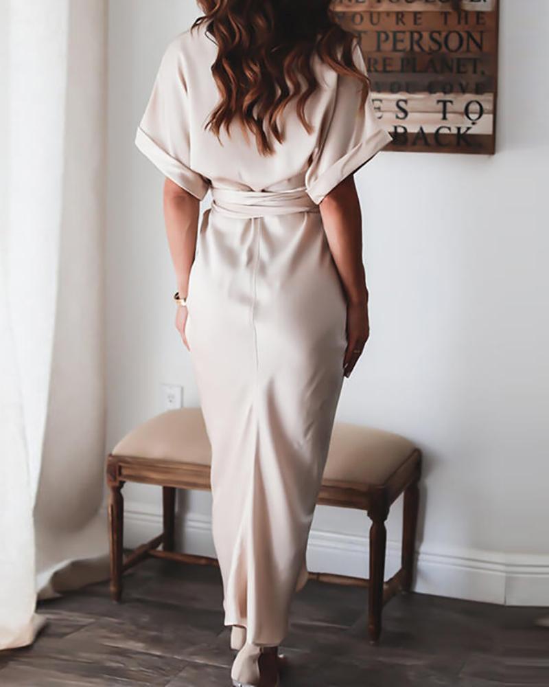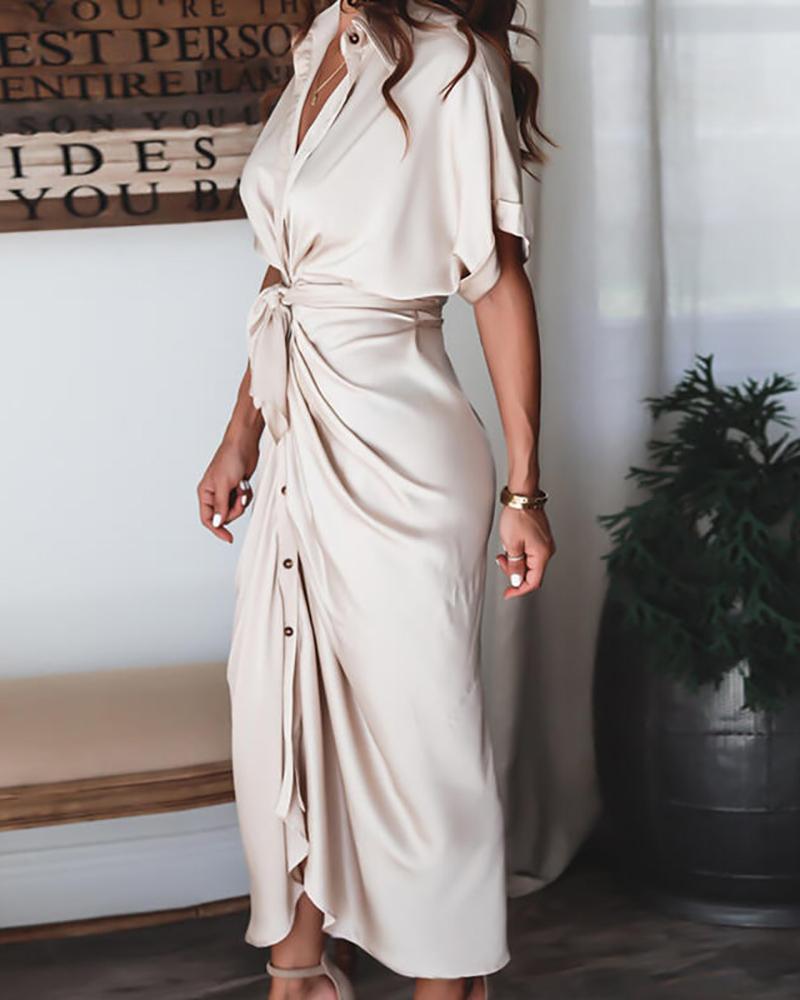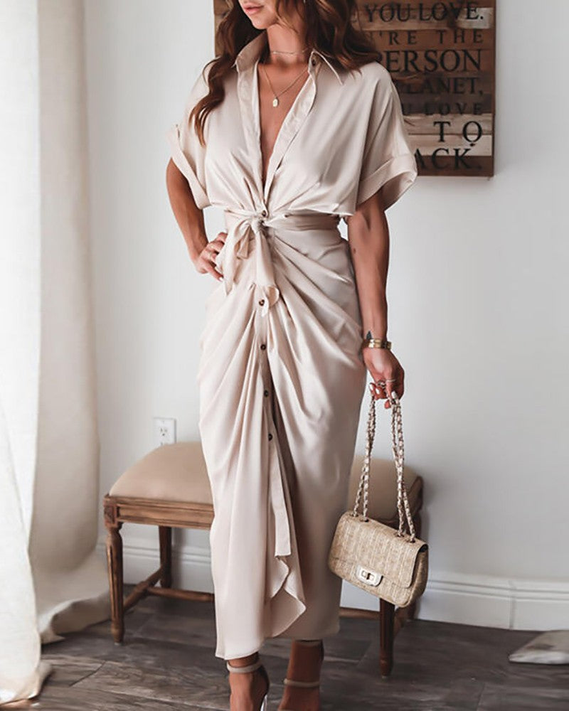 Half Sleeve Ruched Buttoned Tie Front Shirt Dress