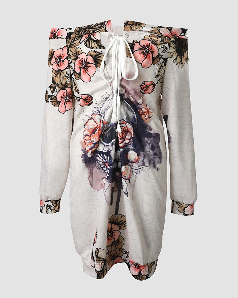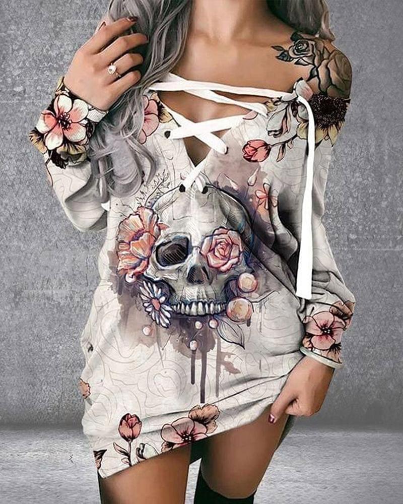 Halloween Eyelet Lace up Skull Floral Print Casual Dress