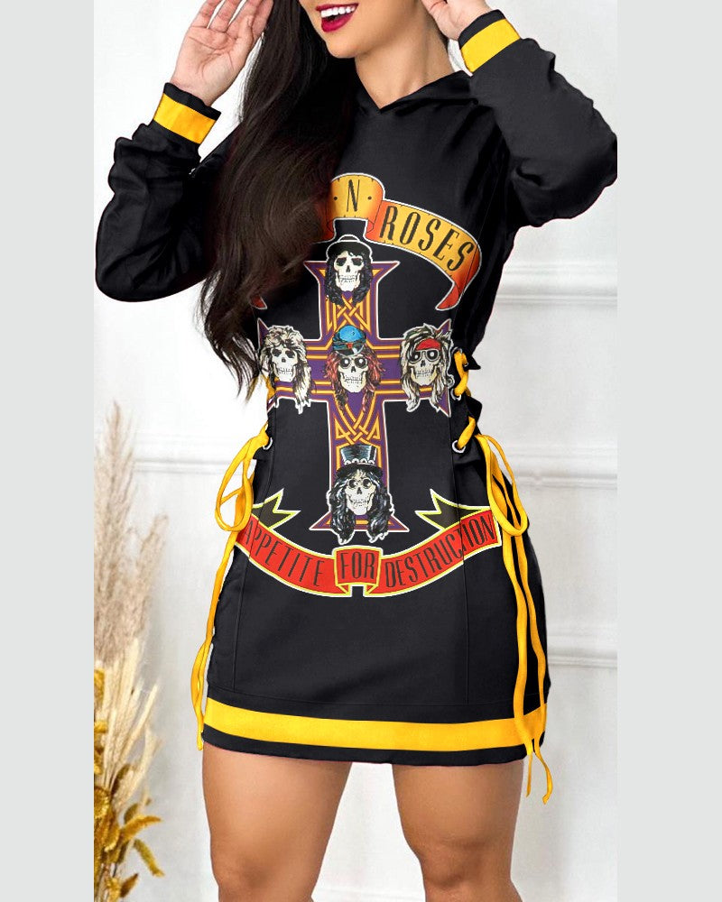 Halloween Skull Letter Cross Graphic Print Lace up Casual Dress