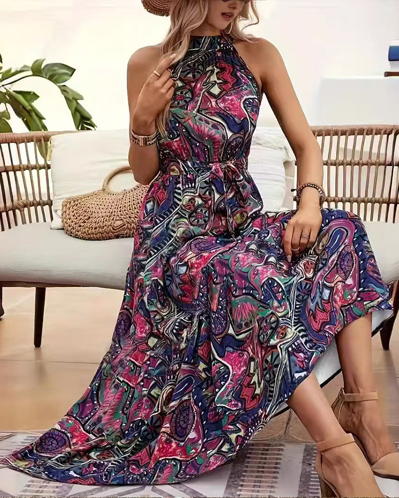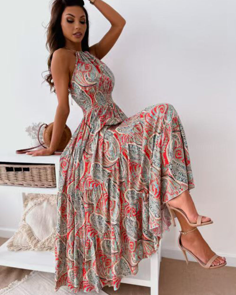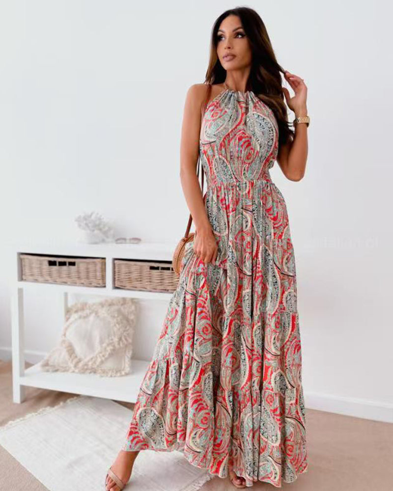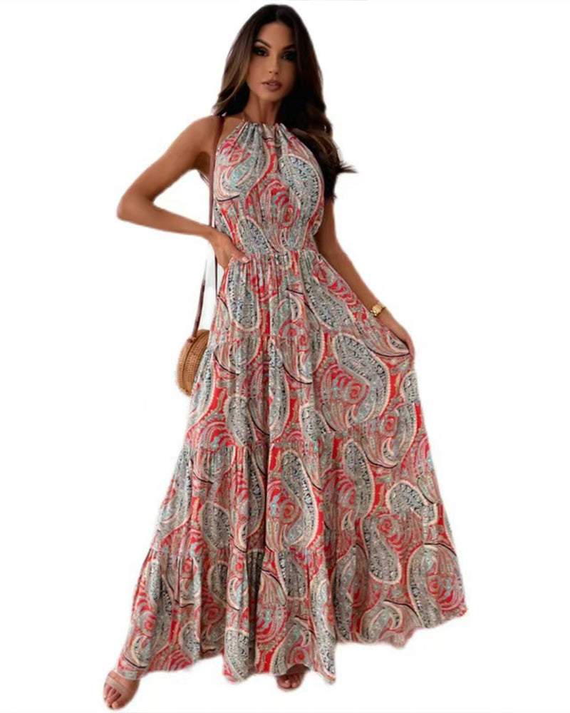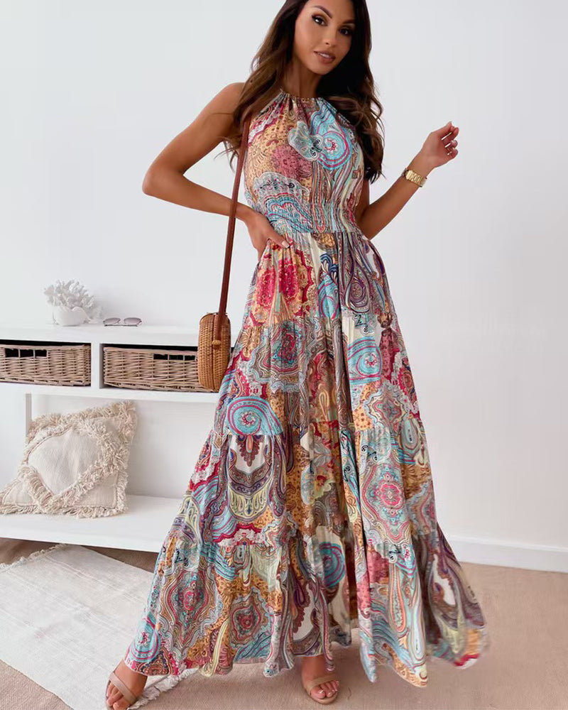 Halter Neck Sleeveless Long Hem Paisley Print Dress