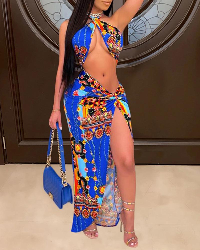 Halter Floral Graphic Print Cutout Front High Slit Dress
