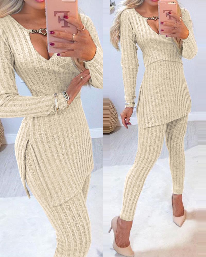Heart Chain Decor Crisscross Slit Ribbed Top & Skinny Pants Set
