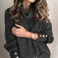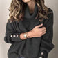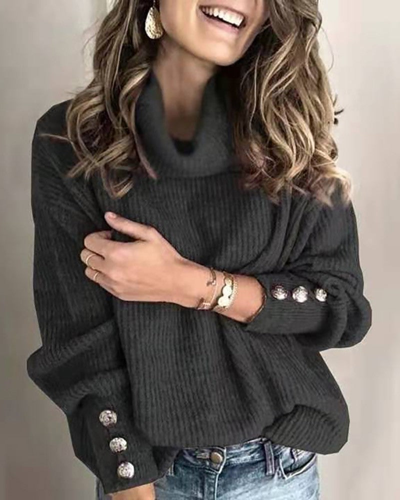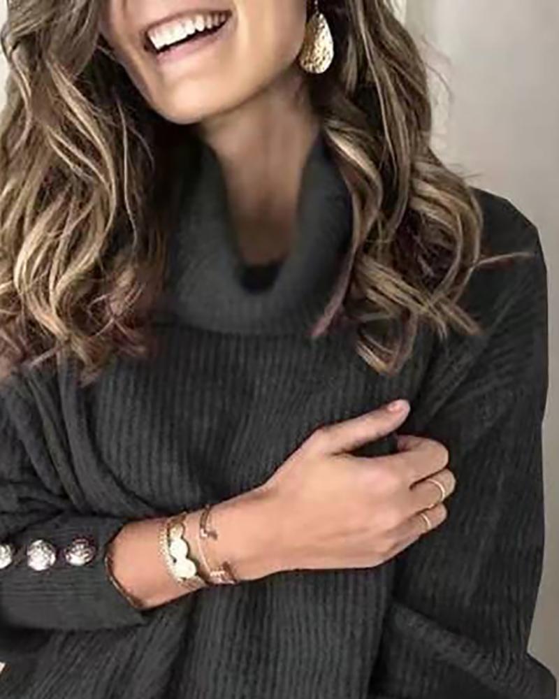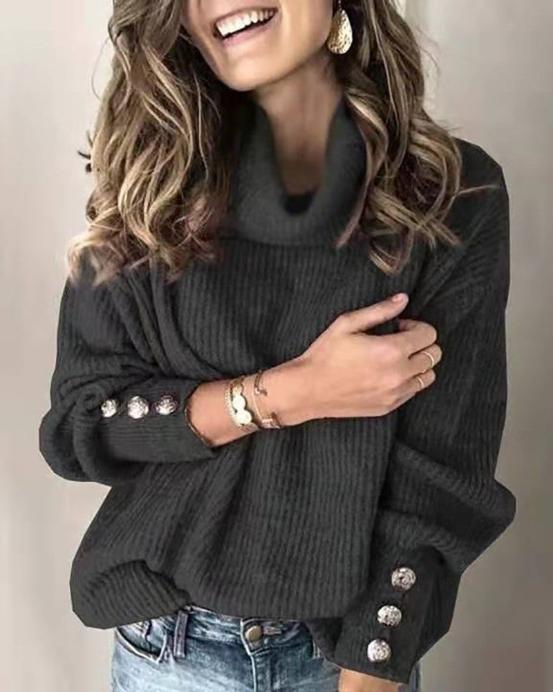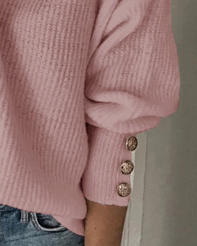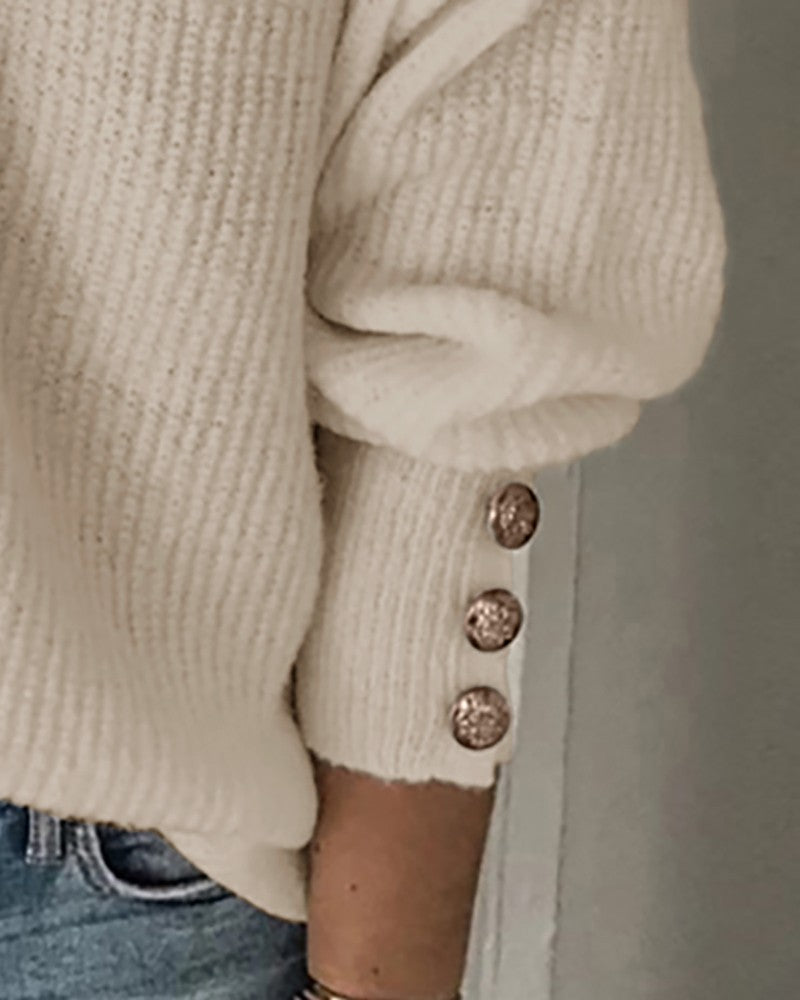 High Neck Lantern Sleeve Buttoned Knit Ribbed Top