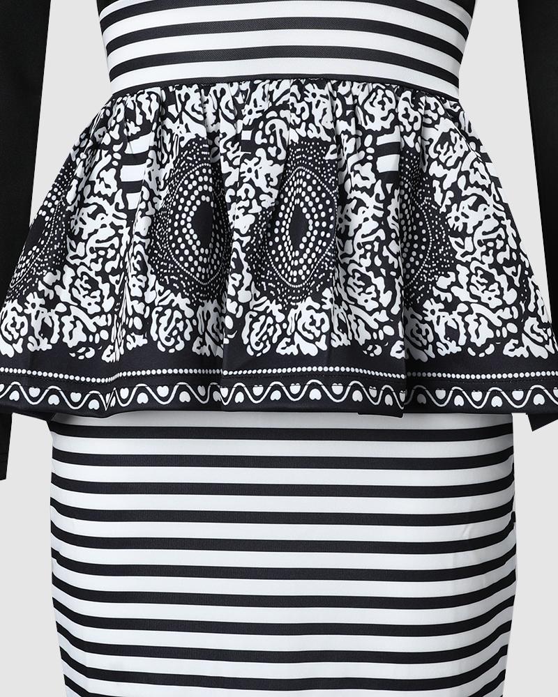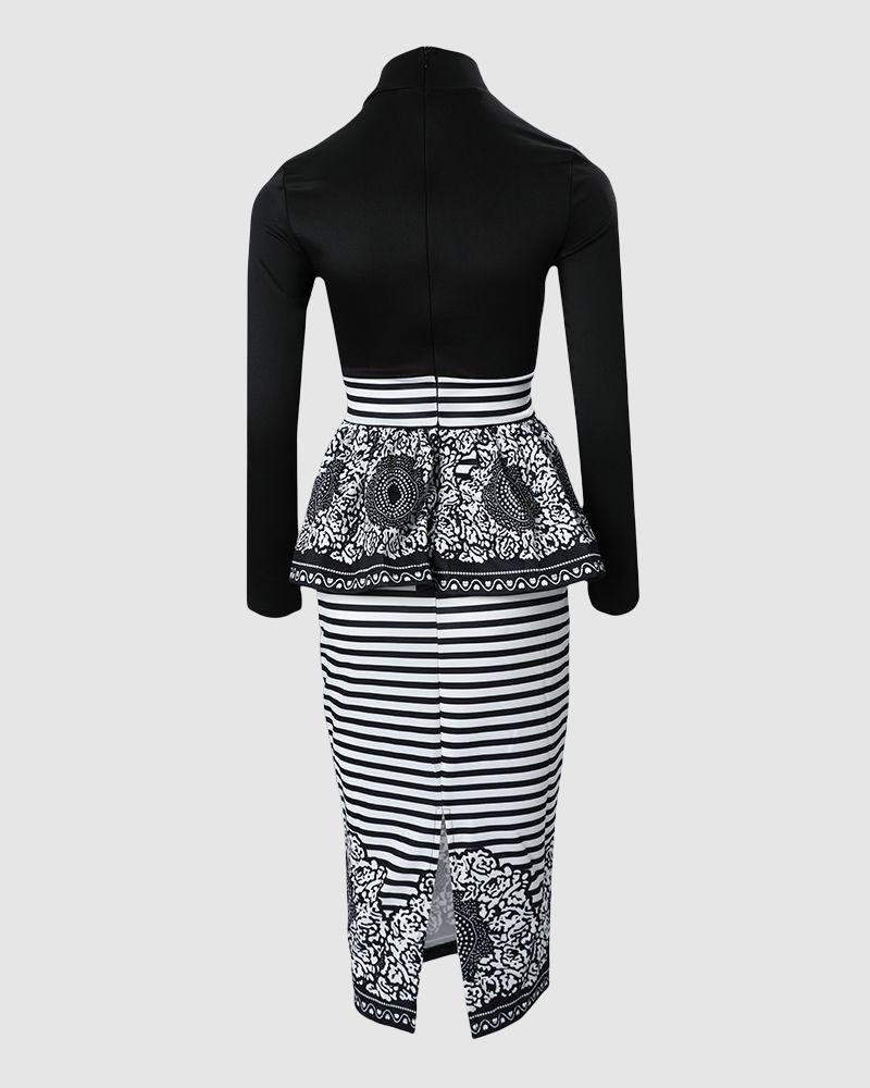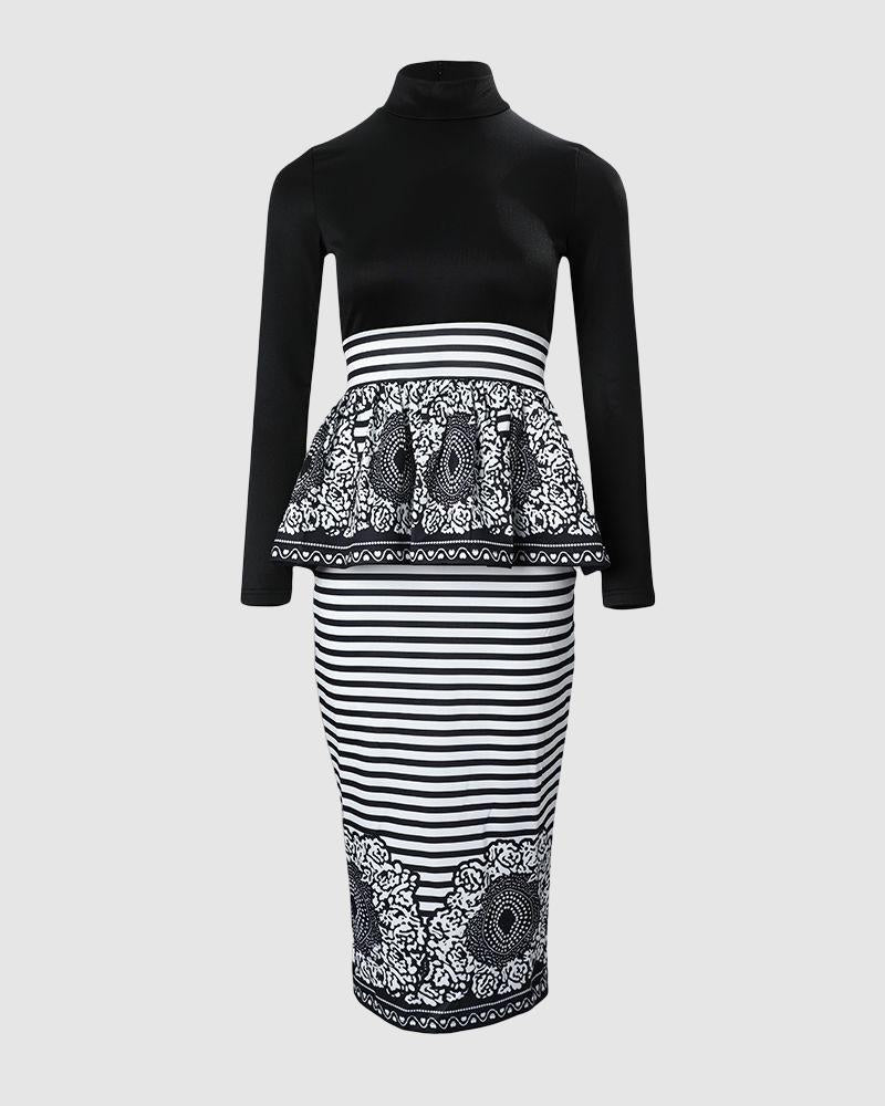 High Neck Ruffle Hem Floral Print Striped Dress