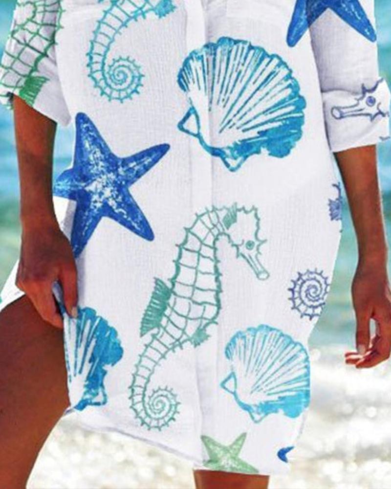 Hippocampus Shell Print Long Sleeve Shirt Dress