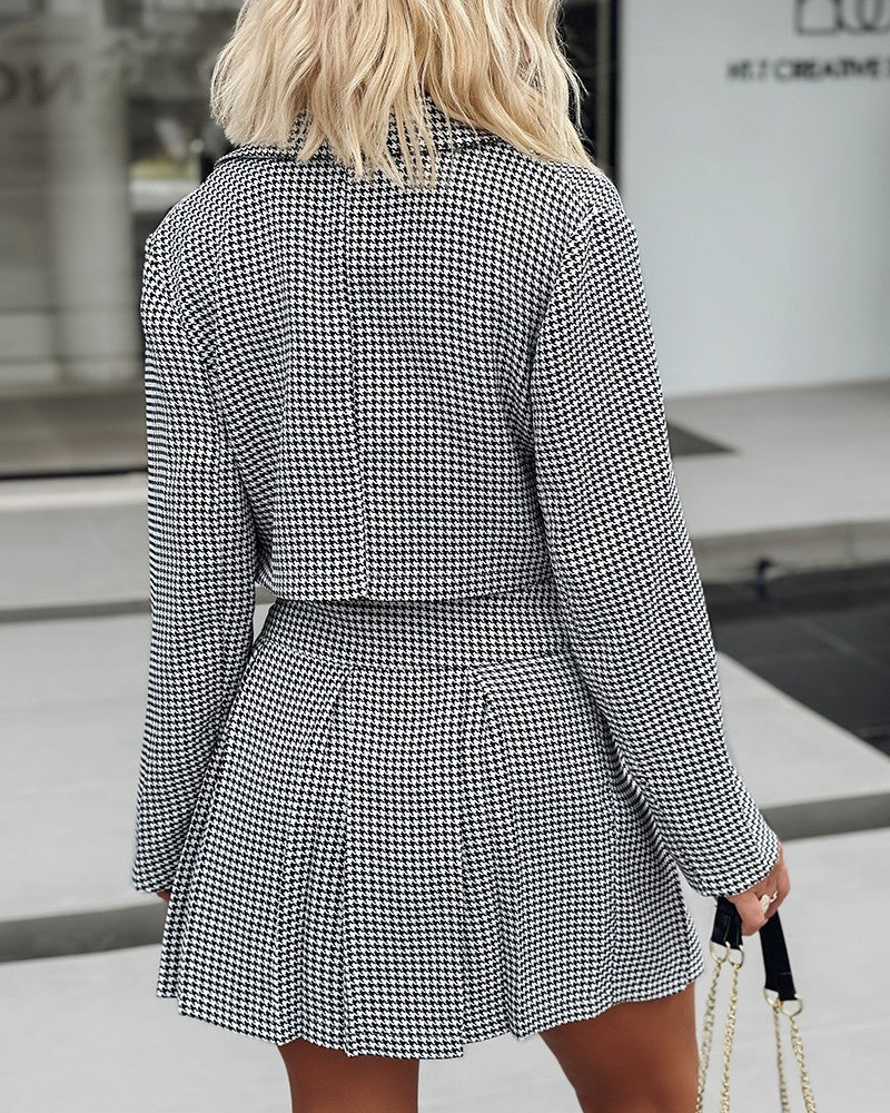 Houndstooth Print Buttoned Blazer Coat & Pleated Skirt Set