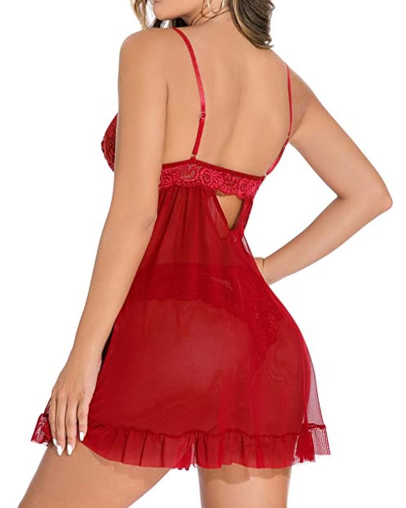 Lace Patch Sheer Mesh Ruffles Babydoll With Panty