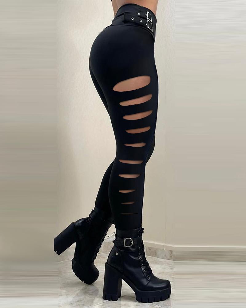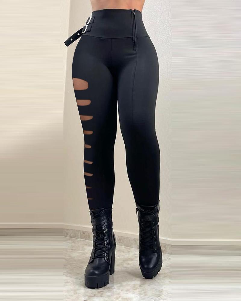 Ladder Cutout Buckle Decor High Waist Skinny Pants