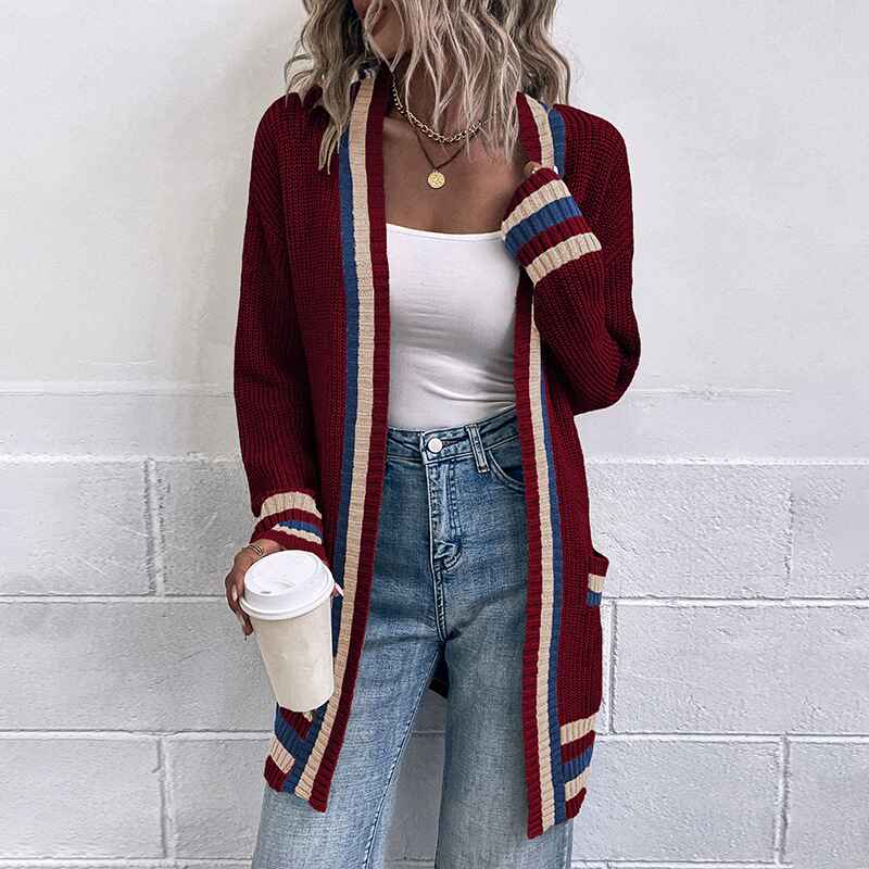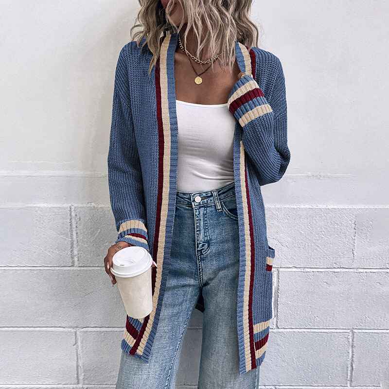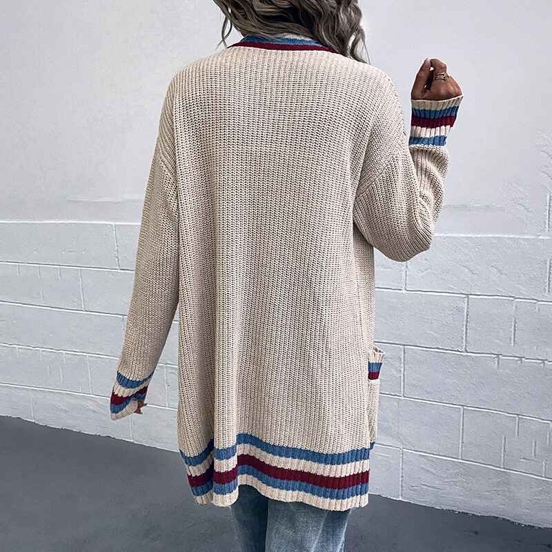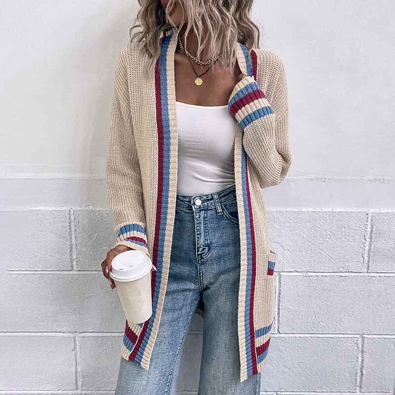 Women Striped Cardigan Sweater Open Front Button Down Cardigan Coat Outwear with Pockets K410
