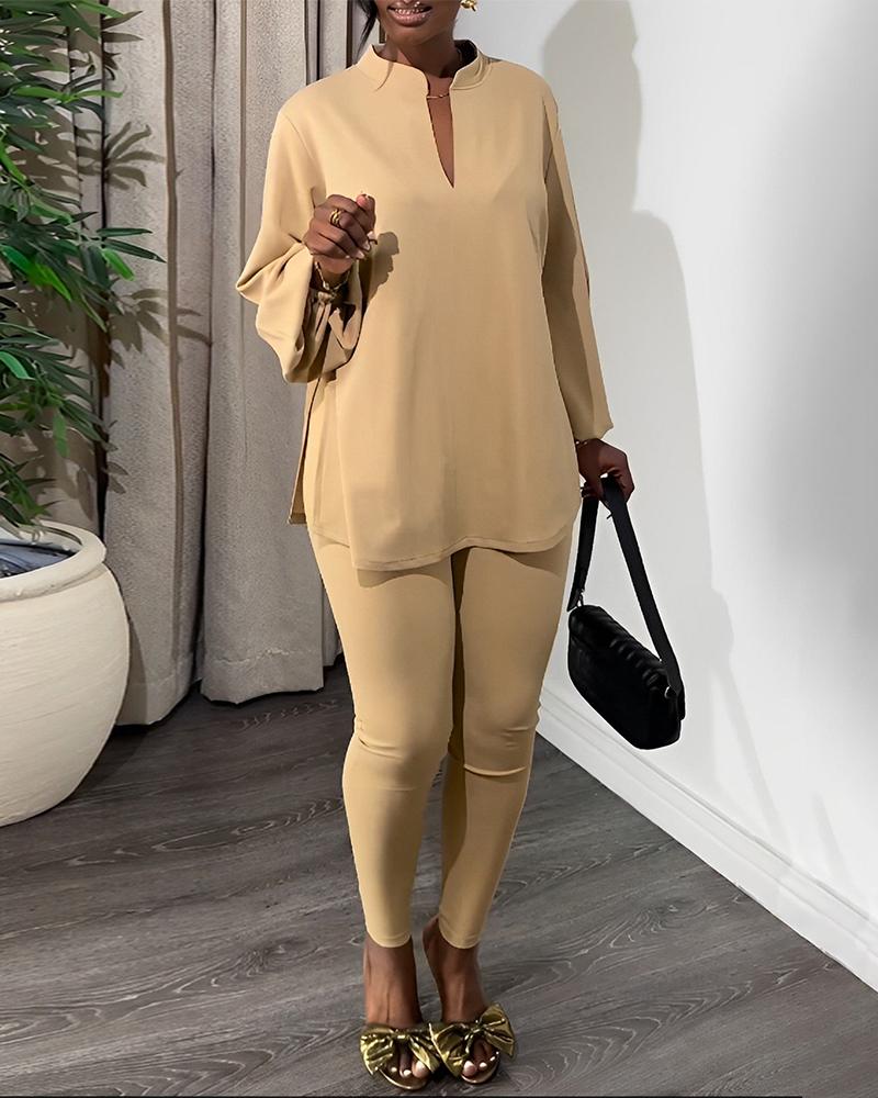 Lantern Sleeve Side Slit Top & Skinny Pants Set