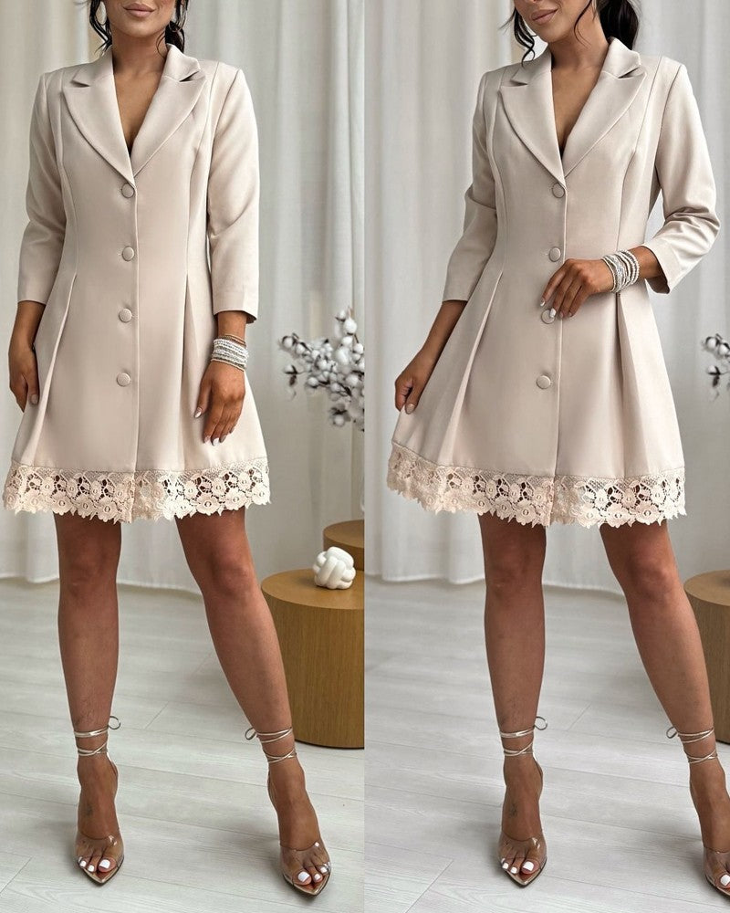 Lapel Neck Button Down Ruched Lace Trim Blazer Dress