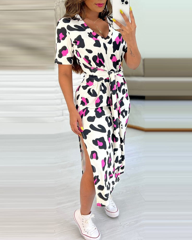 Leopard Print Tied Detail Slit Casual Dress
