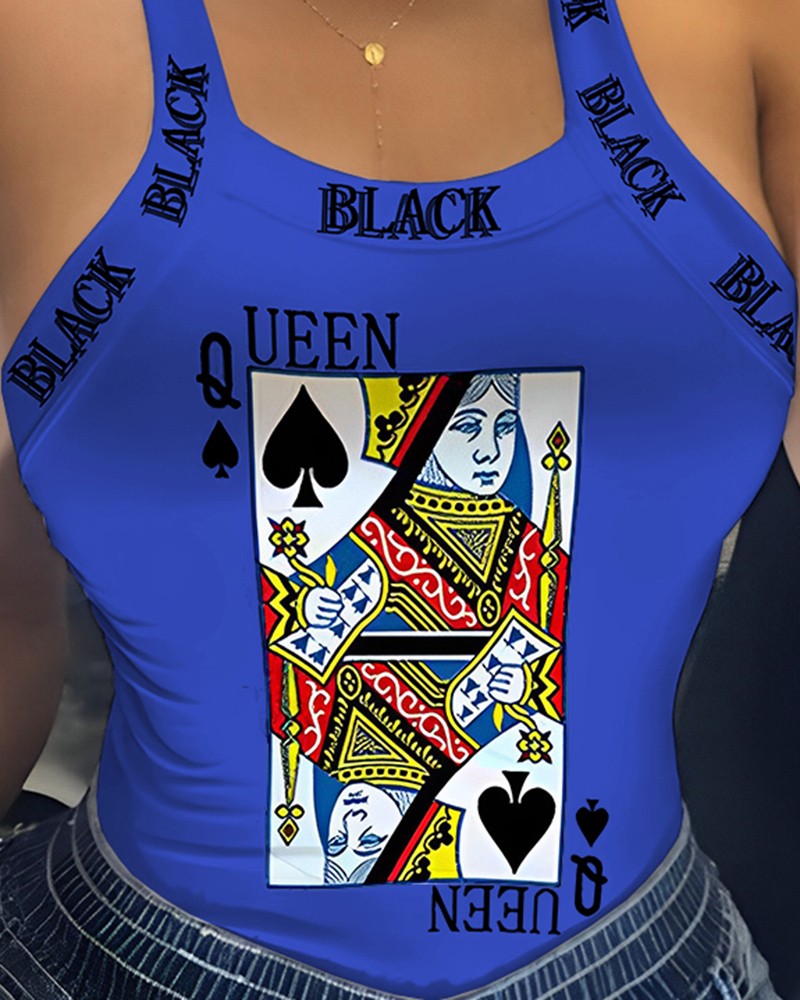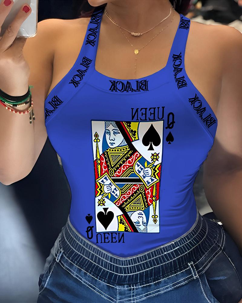 Letter Poker Print Sleeveless Bowknot Decor Top