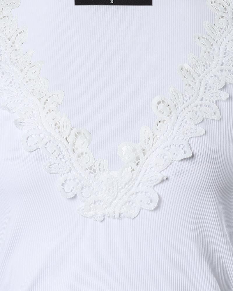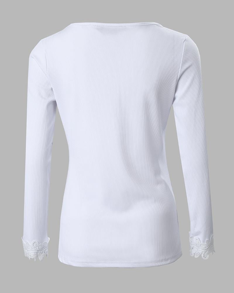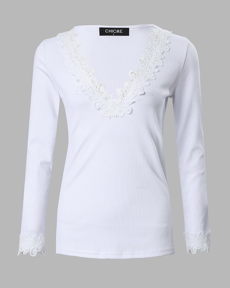 Long Sleeve Contrast Lace V Neck Ribbed Top