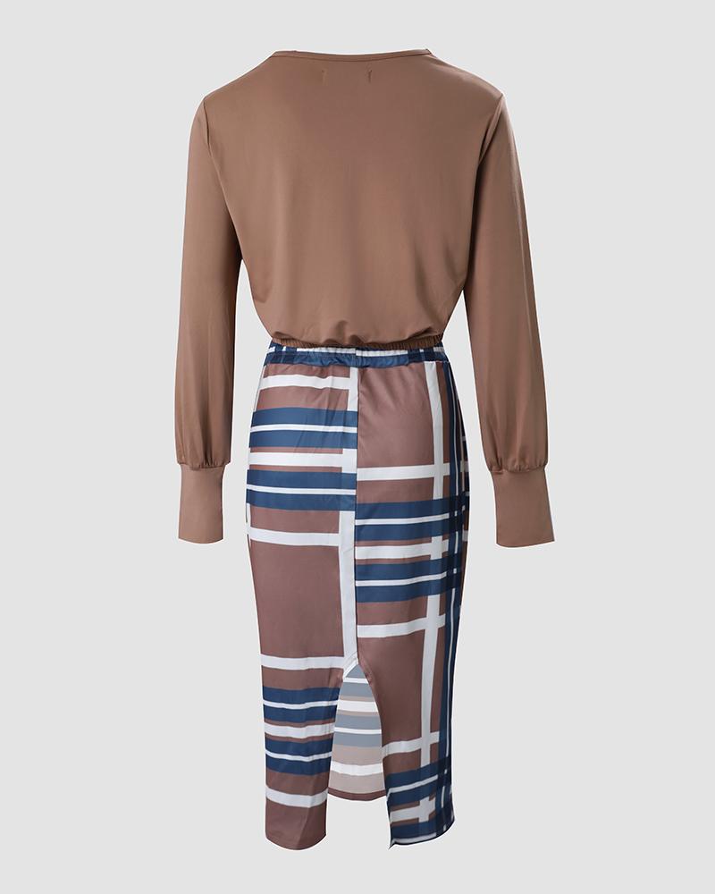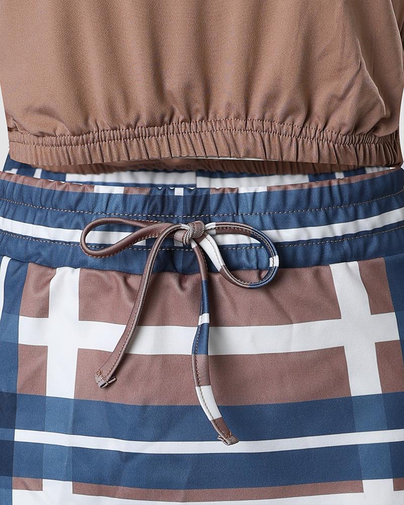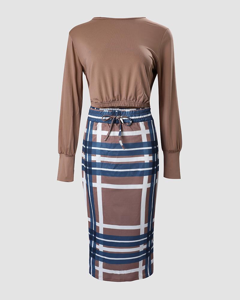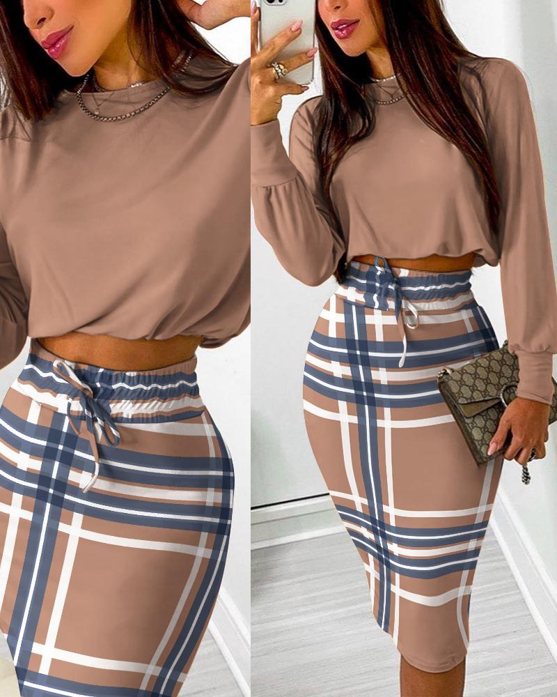 Long Sleeve Crop Top & Drawstring Plaid Skirt Set
