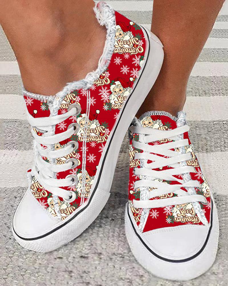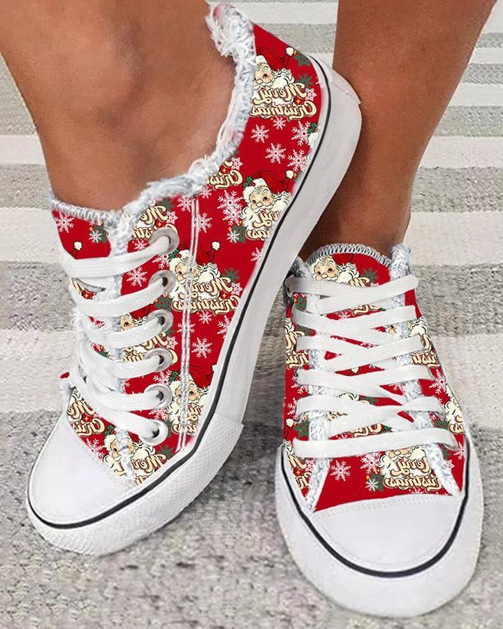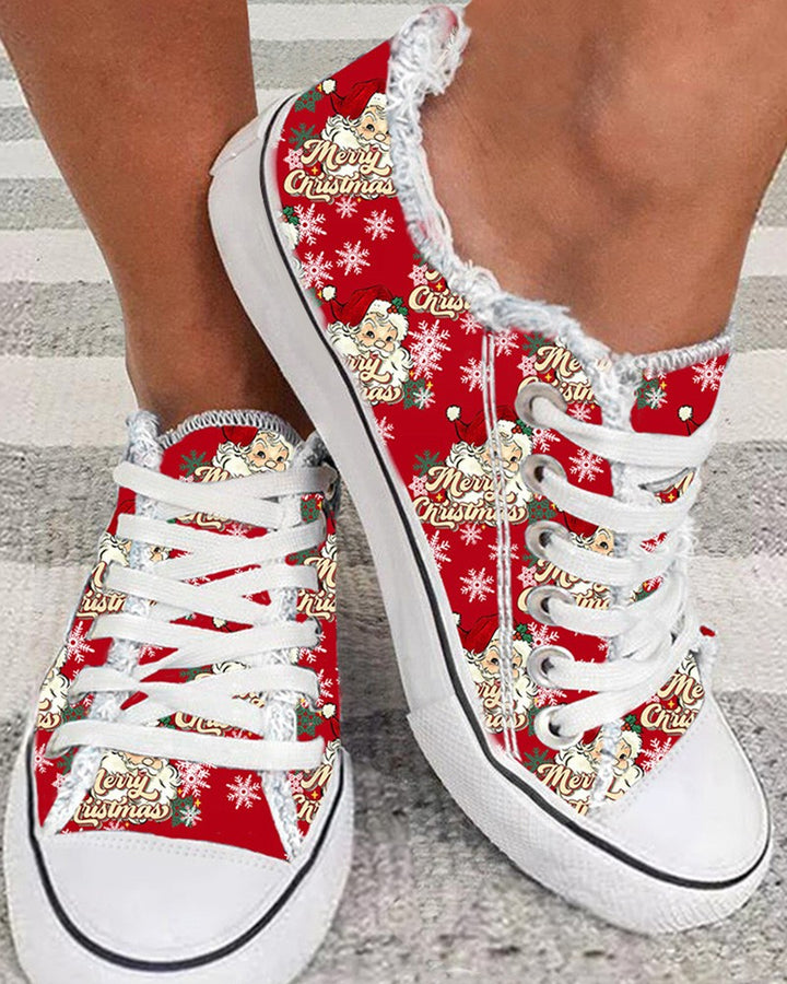 Merry Christmas Santa Claus Snowflake Print Raw Hem Sneakers