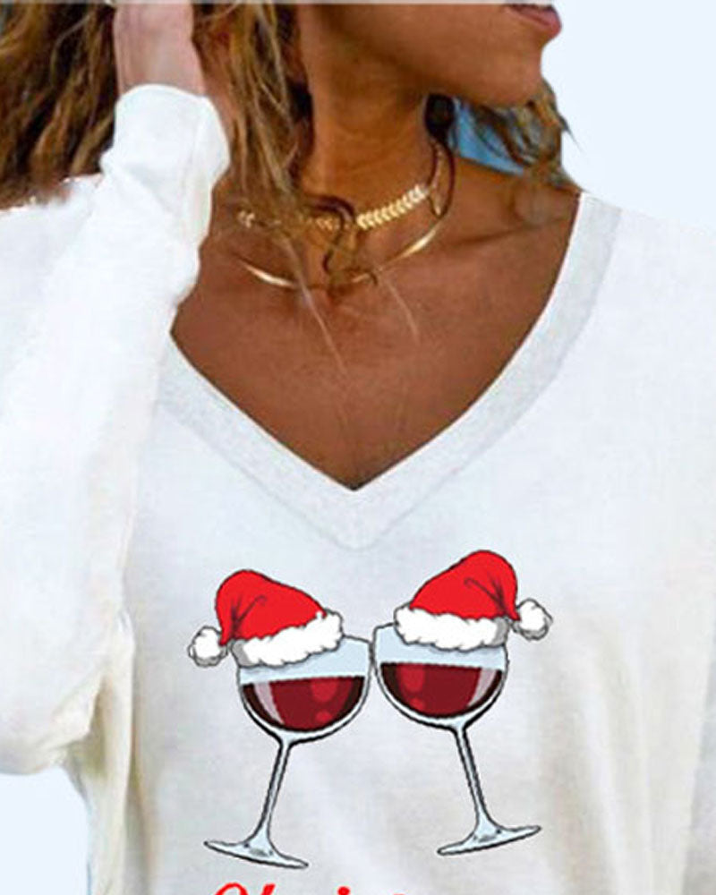 Merry Christmas Wine Glass Print Long Sleeve Top
