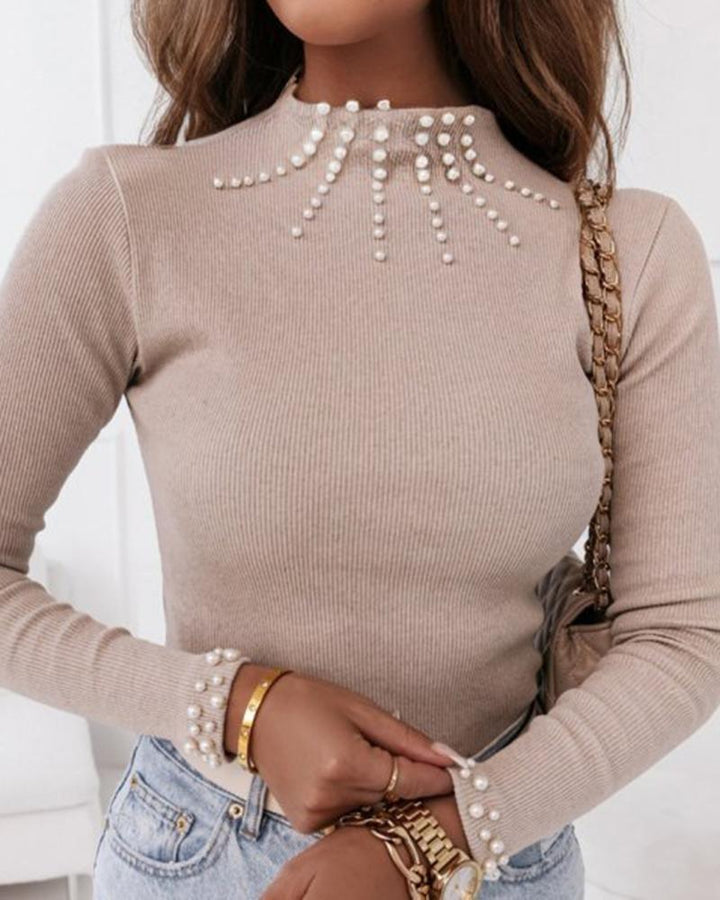 Mock Neck Long Sleeve Beaded Top