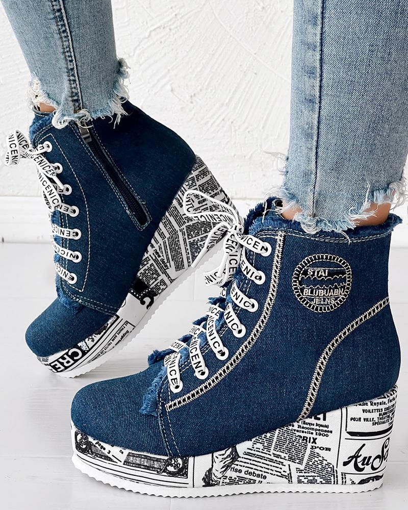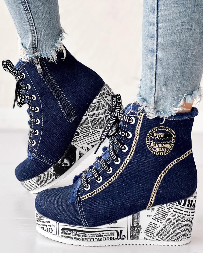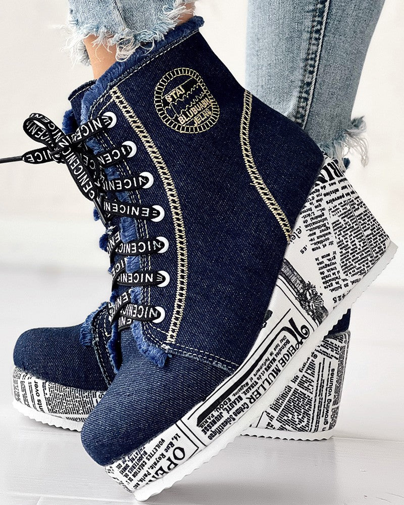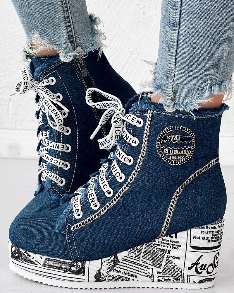 Newpaper Lace up Raw Hem Wedge Denim Ankle Boots
