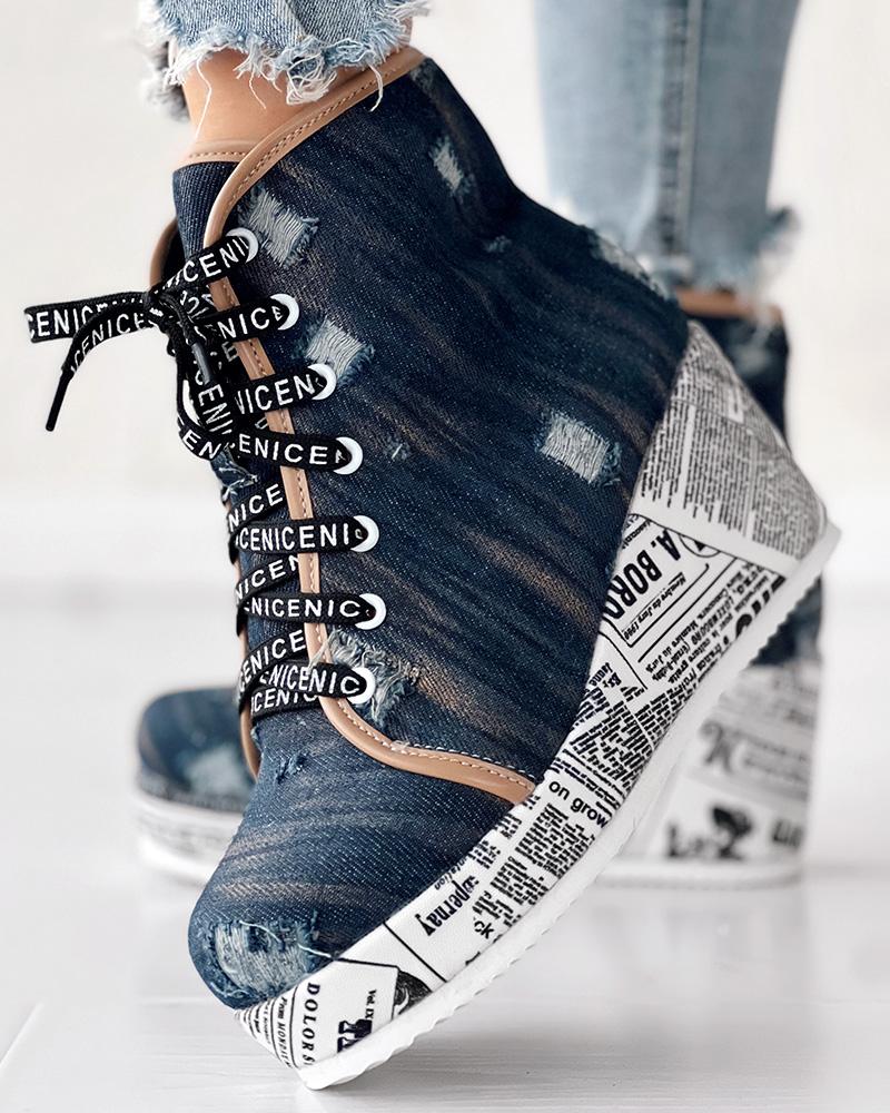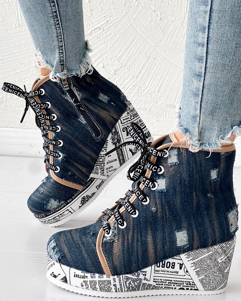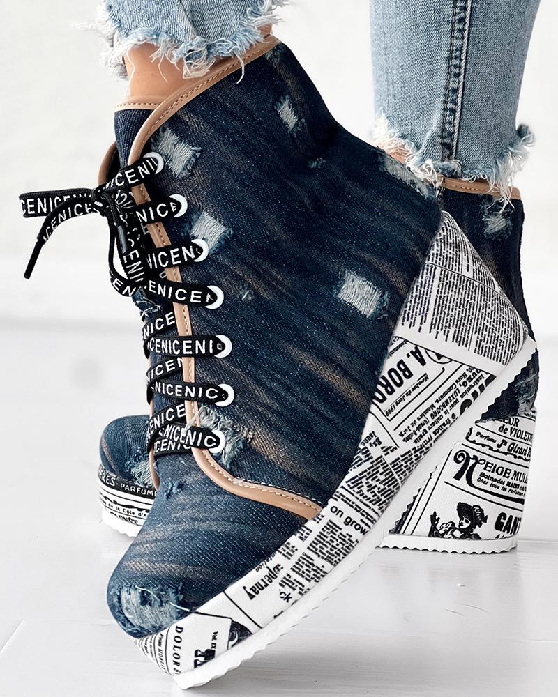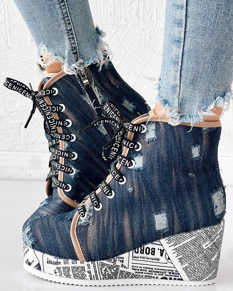 Newpaper Platform Washed Denim Ripped Wedge Ankle Boots