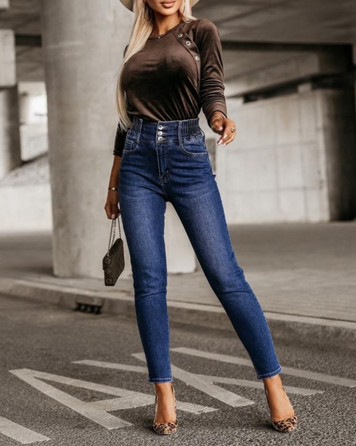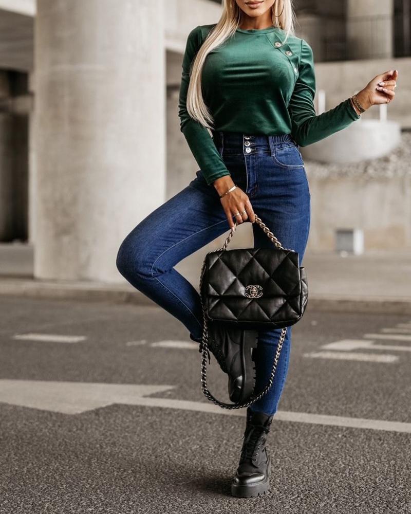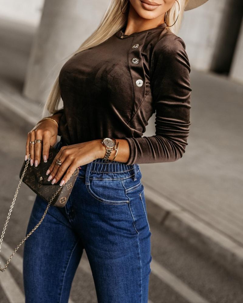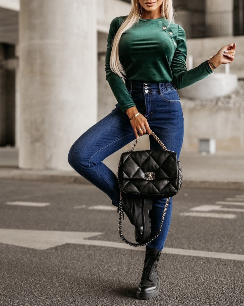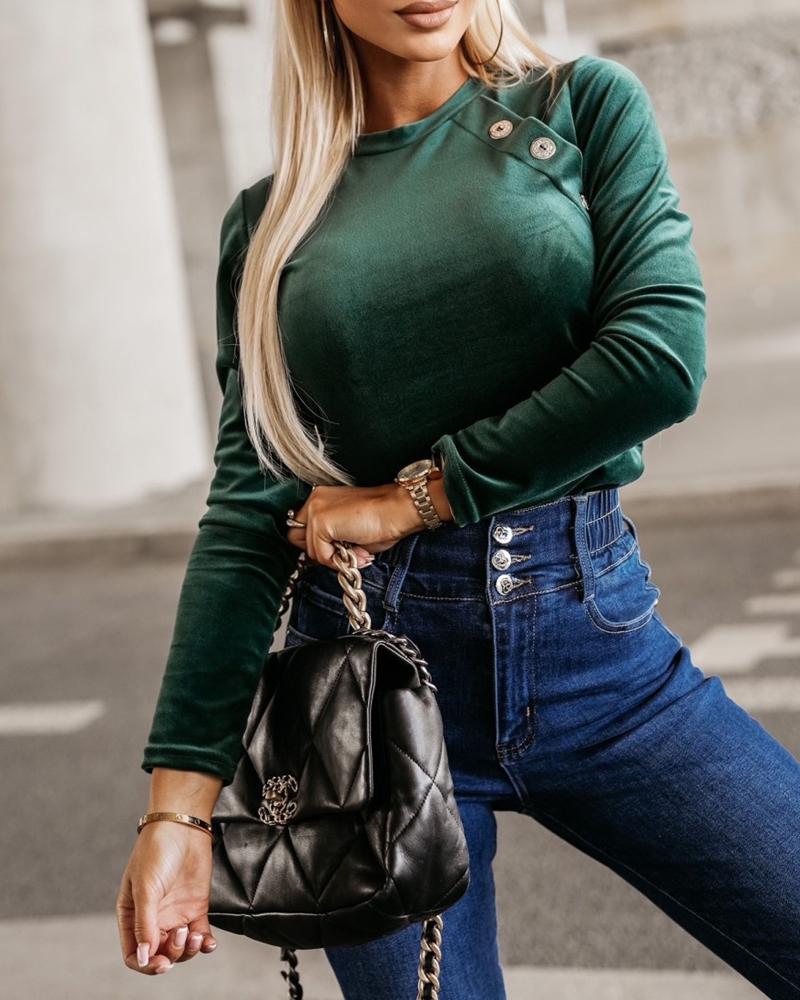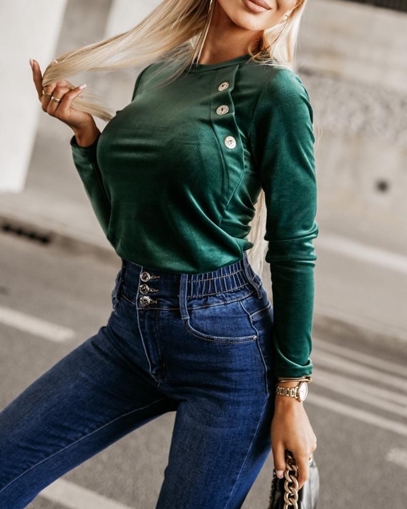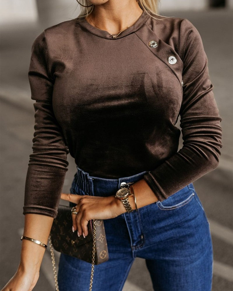 O Neck Buttoned Long Sleeve Velvet Top