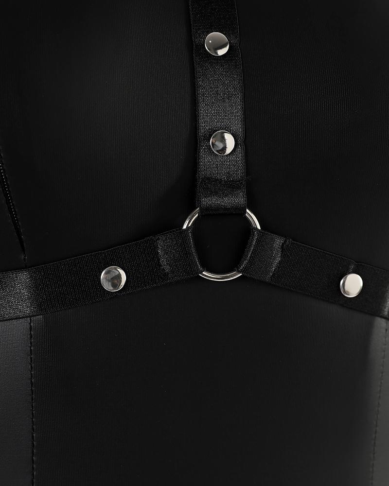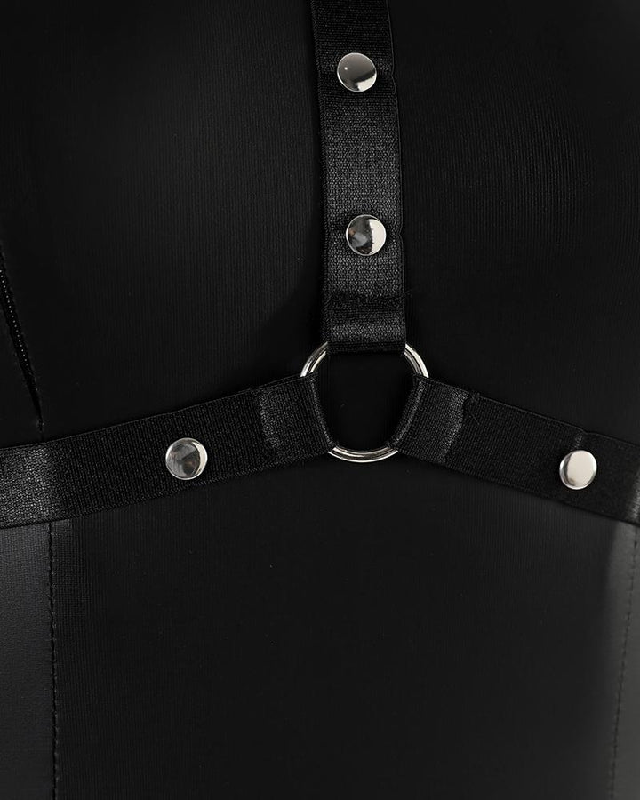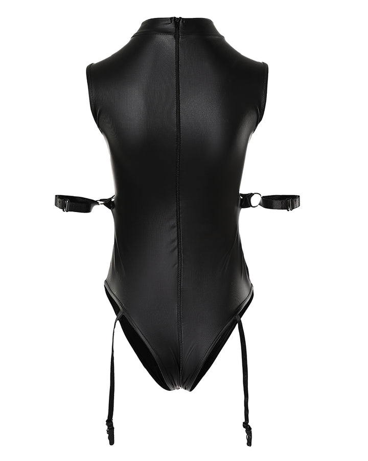 O Neck Cutout Bondage Crotchless PU Leather Teddy