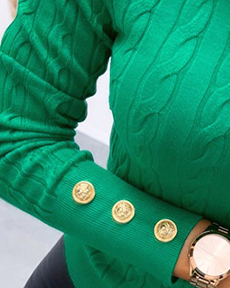 O neck Long Sleeve Buttoned Braided Knit Sweater