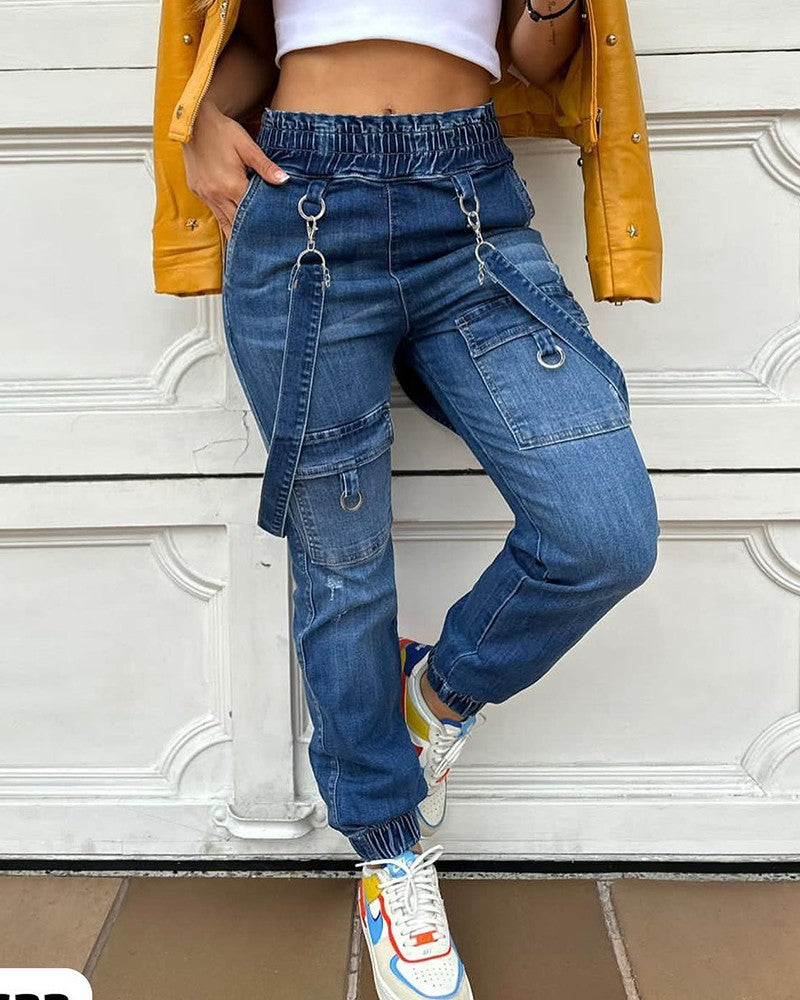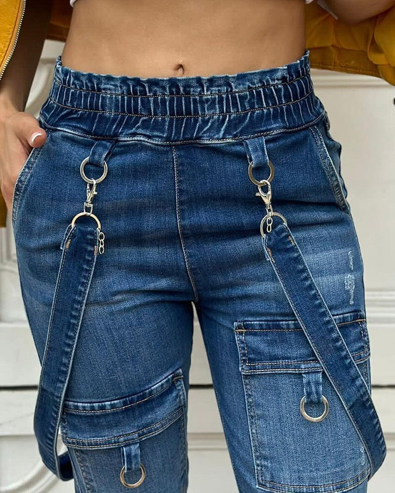 O Ring Decor Pocket Design Denim Suspender Jumpsuit