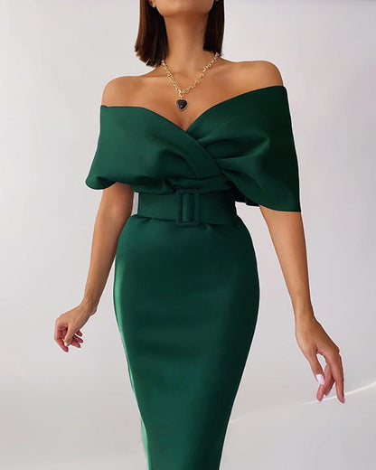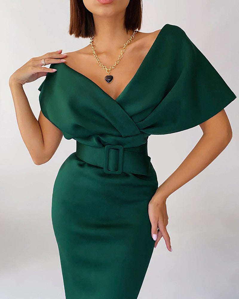 Off Shoulder Flutter Sleeve Work Dress With Belt