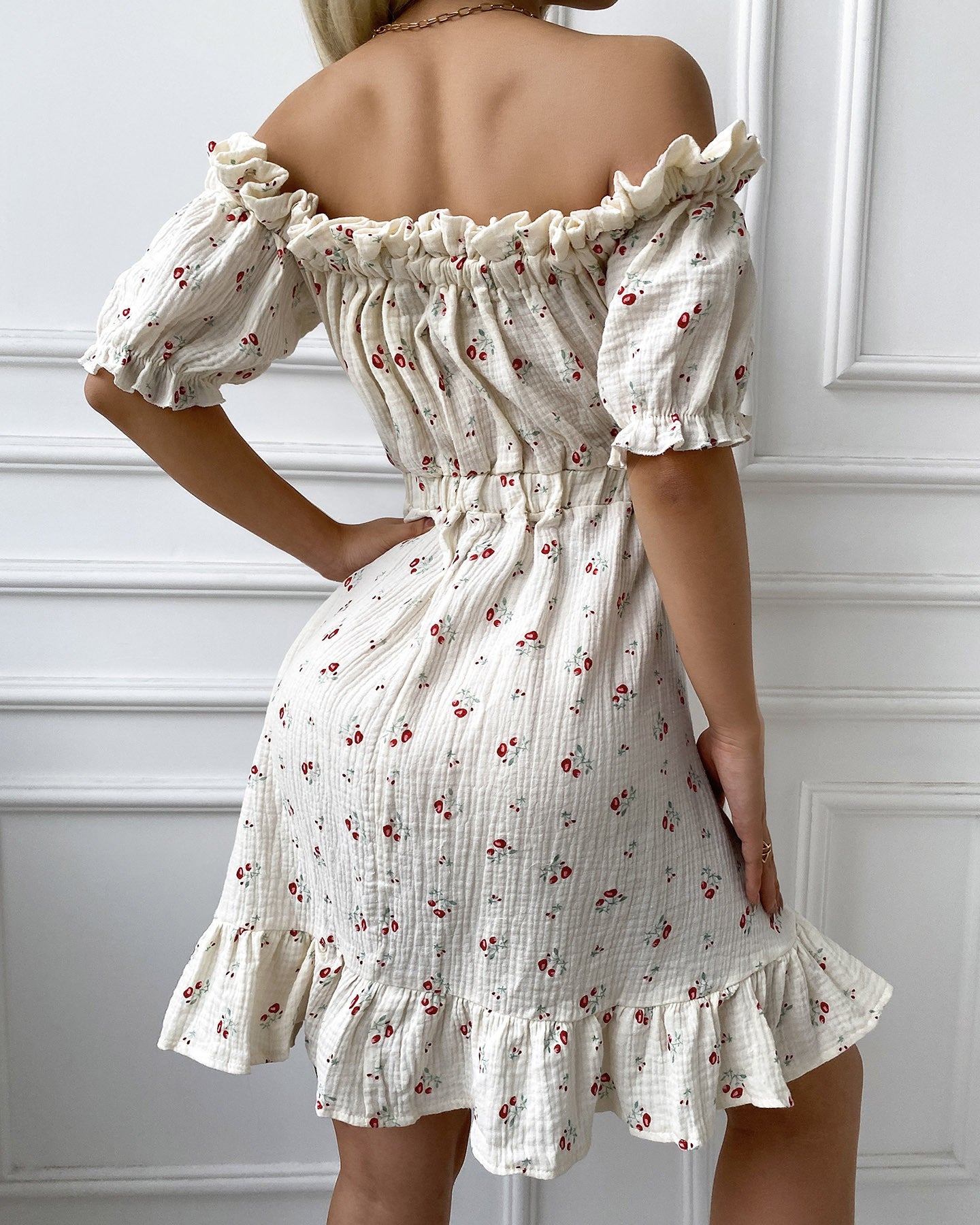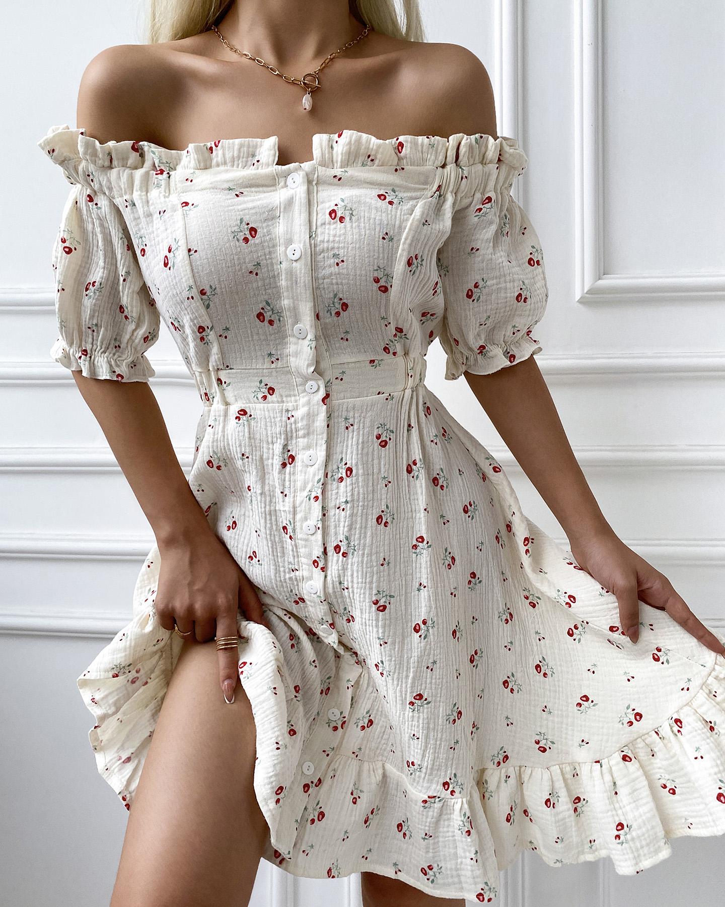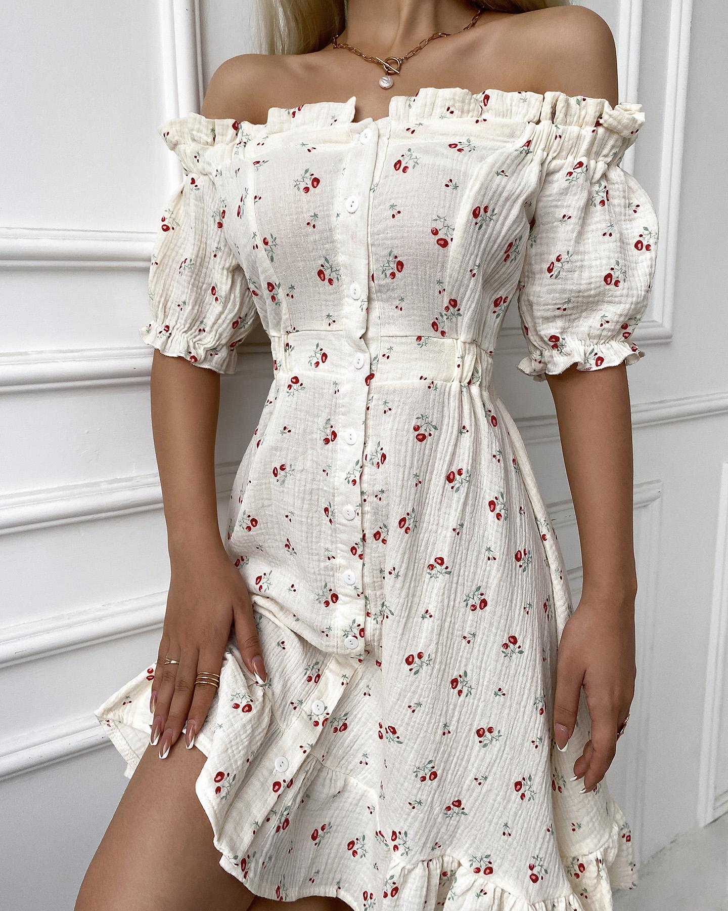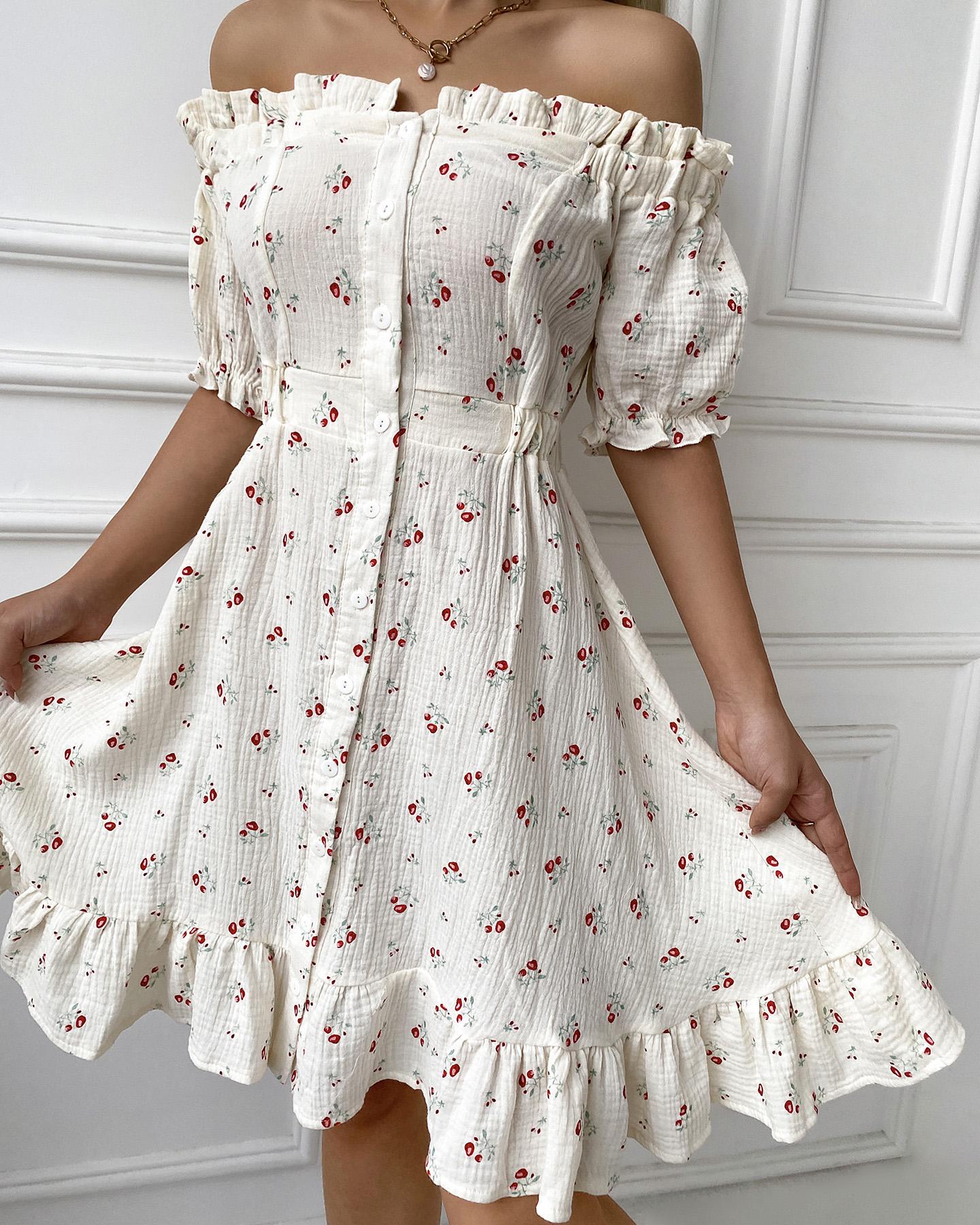 Off Shoulder Frill Hem Ditsy Floral Print Dress