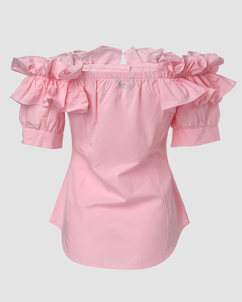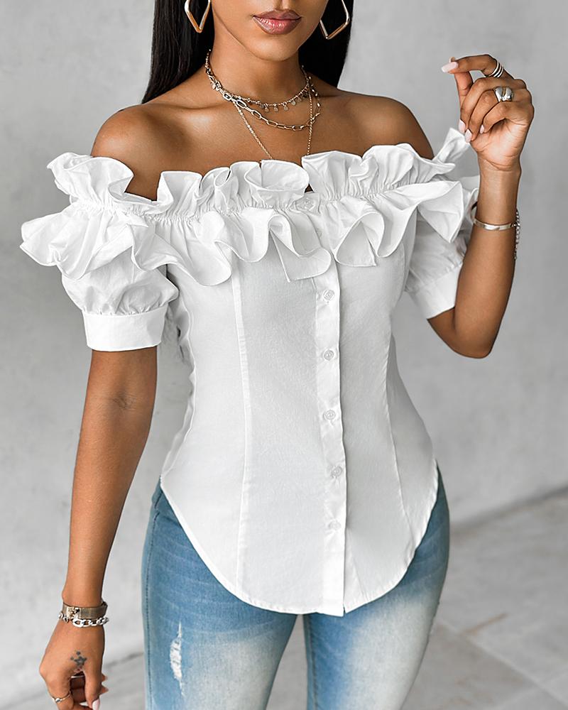 Off Shoulder Layered Ruffles Button down Asymmetrical Hem Top