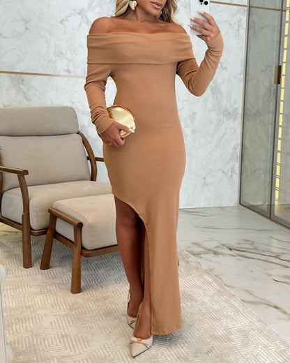 Off Shoulder Side Slit Long Sleeve Casual Dress