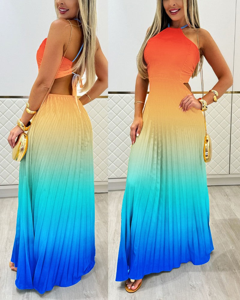 Ombre Halter Pleated Maxi Dress Casual Back Lace Up Summer Vacation Dress