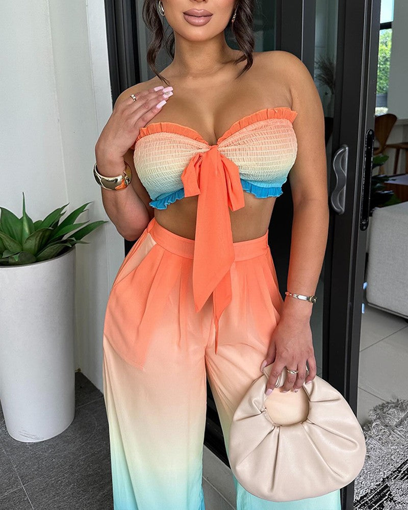 Ombre Shirred Frill Hem Crop Top & Pocket Design Pants Set